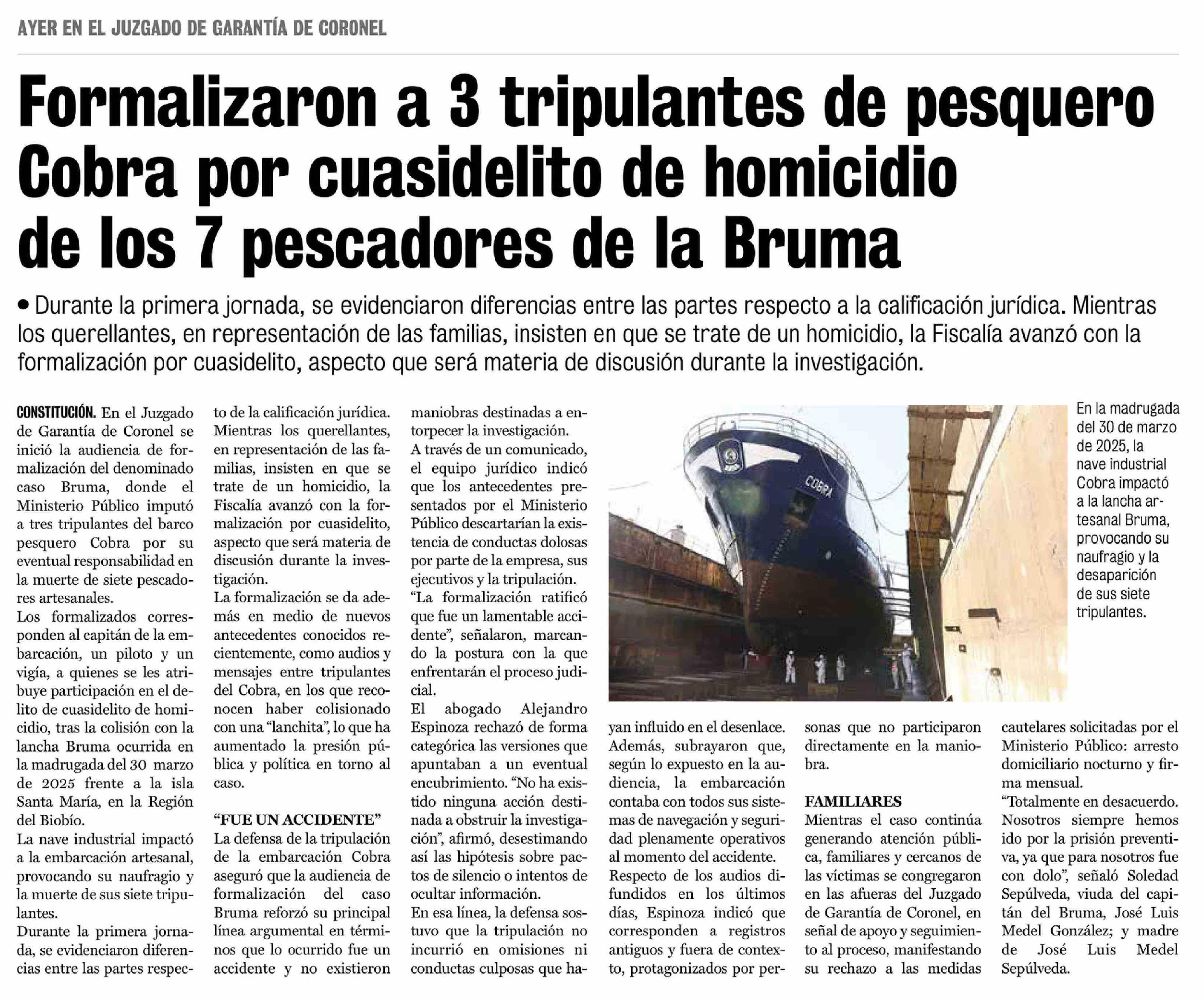 Formalizaron a 3 tripulantes de pesquero Cobra por cuasidelito de homicidio de los 7 pescadores de la Bruma 19-03-2026 La Prensa de Curicó |