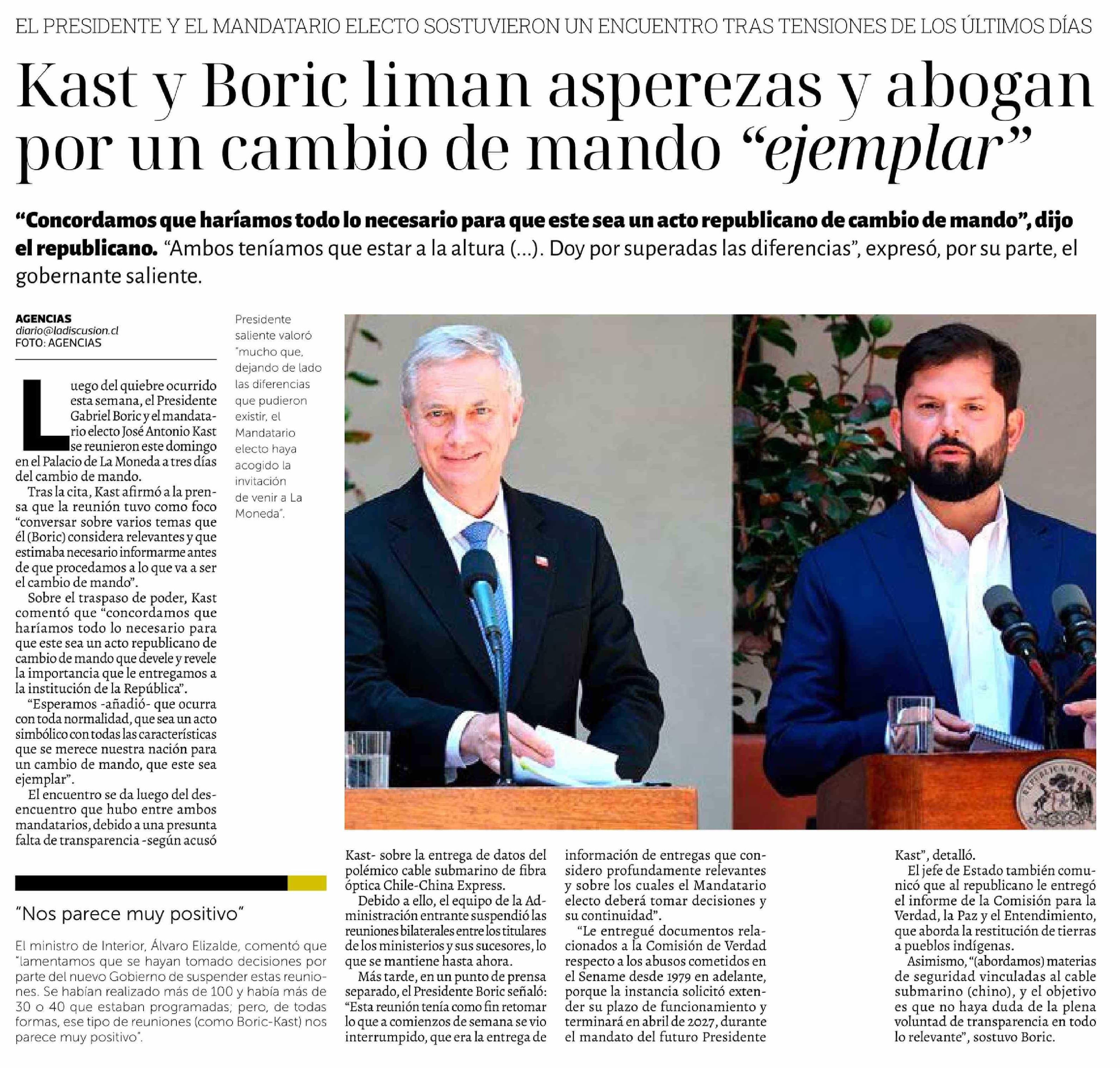 | Título: | Kast y Boric liman asperezas y abogan por un cambio de mando "ejemplar" |