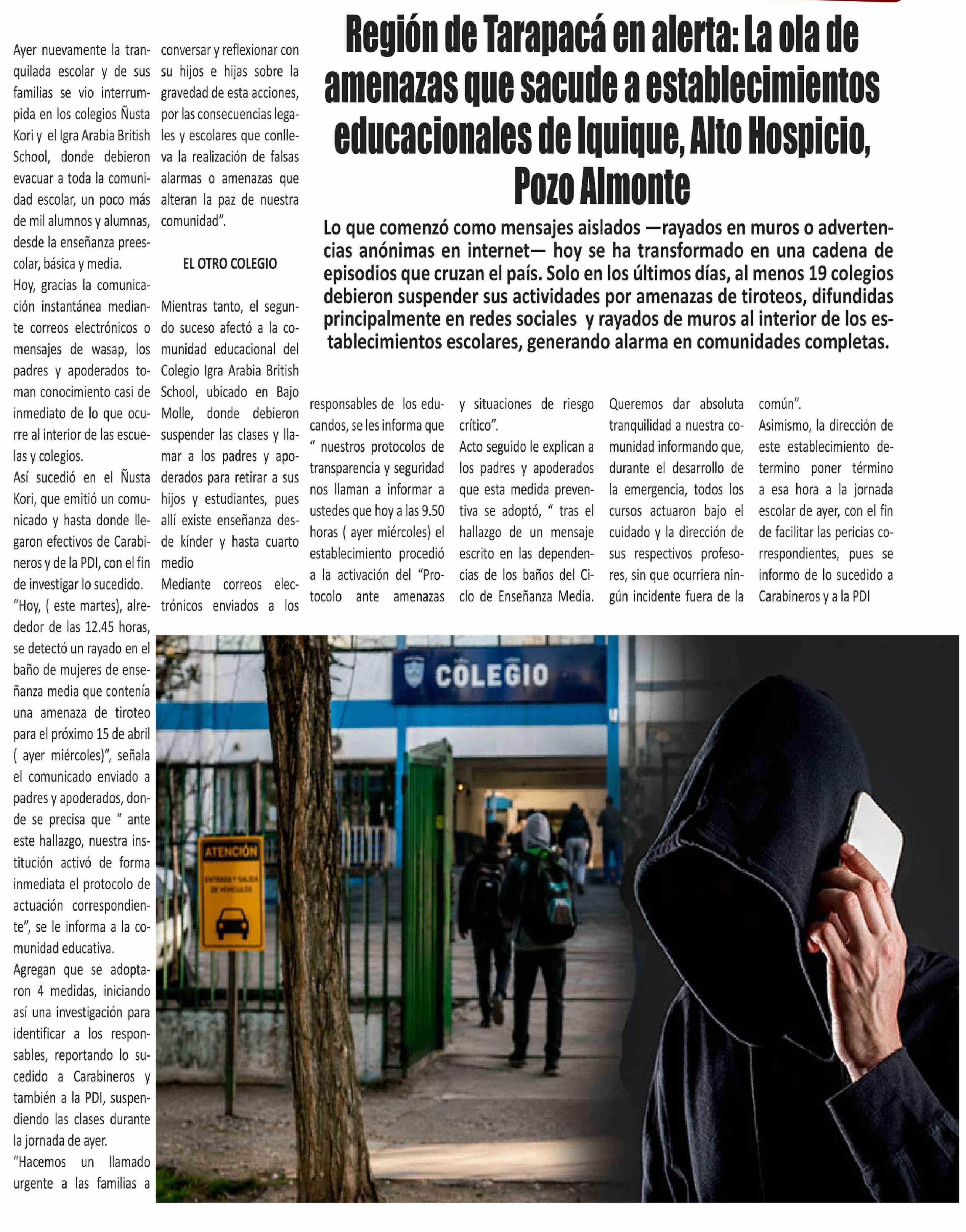 | Título: | Región de Tarapacá en alerta: La ola de amenazas que sacude a establecimientos educacionales de Iquique, Alto Hospicio, Pozo Almonte |