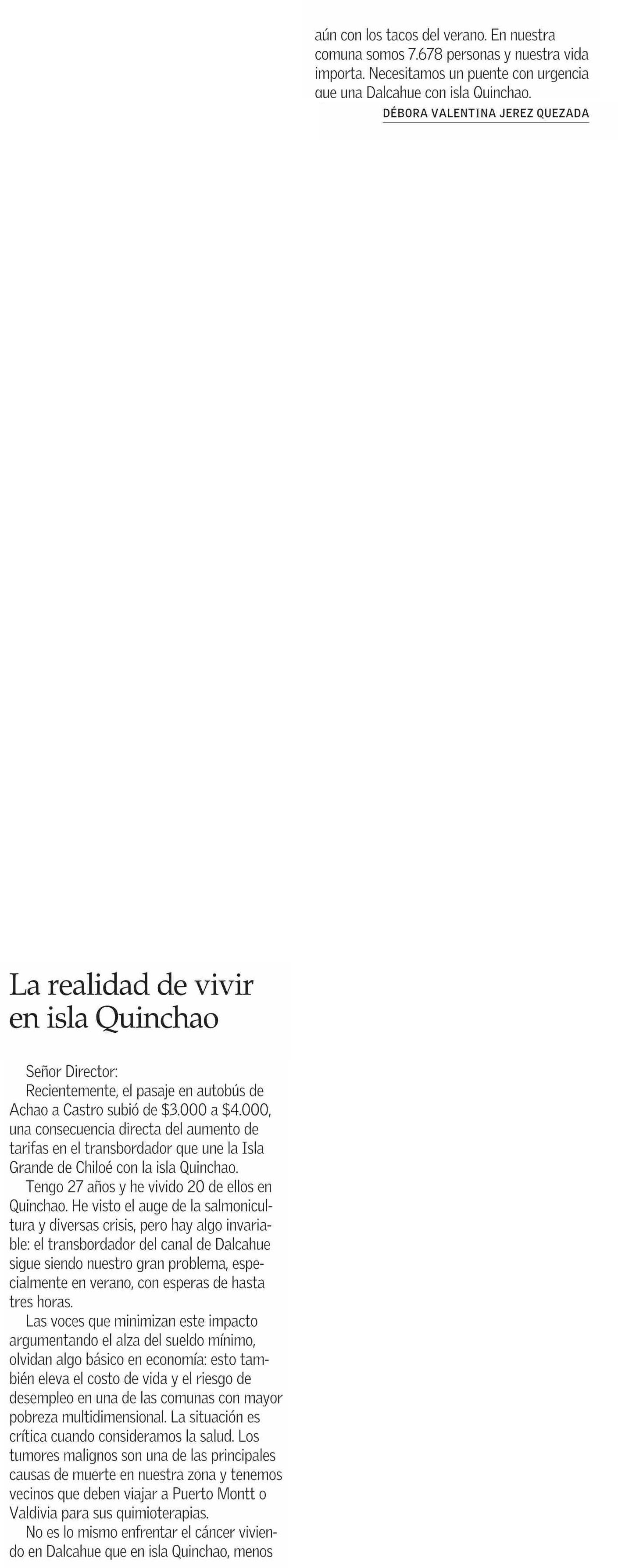 Cartas: La realidad de vivir en isla Quinchao 20-01-2026 El Mercurio |