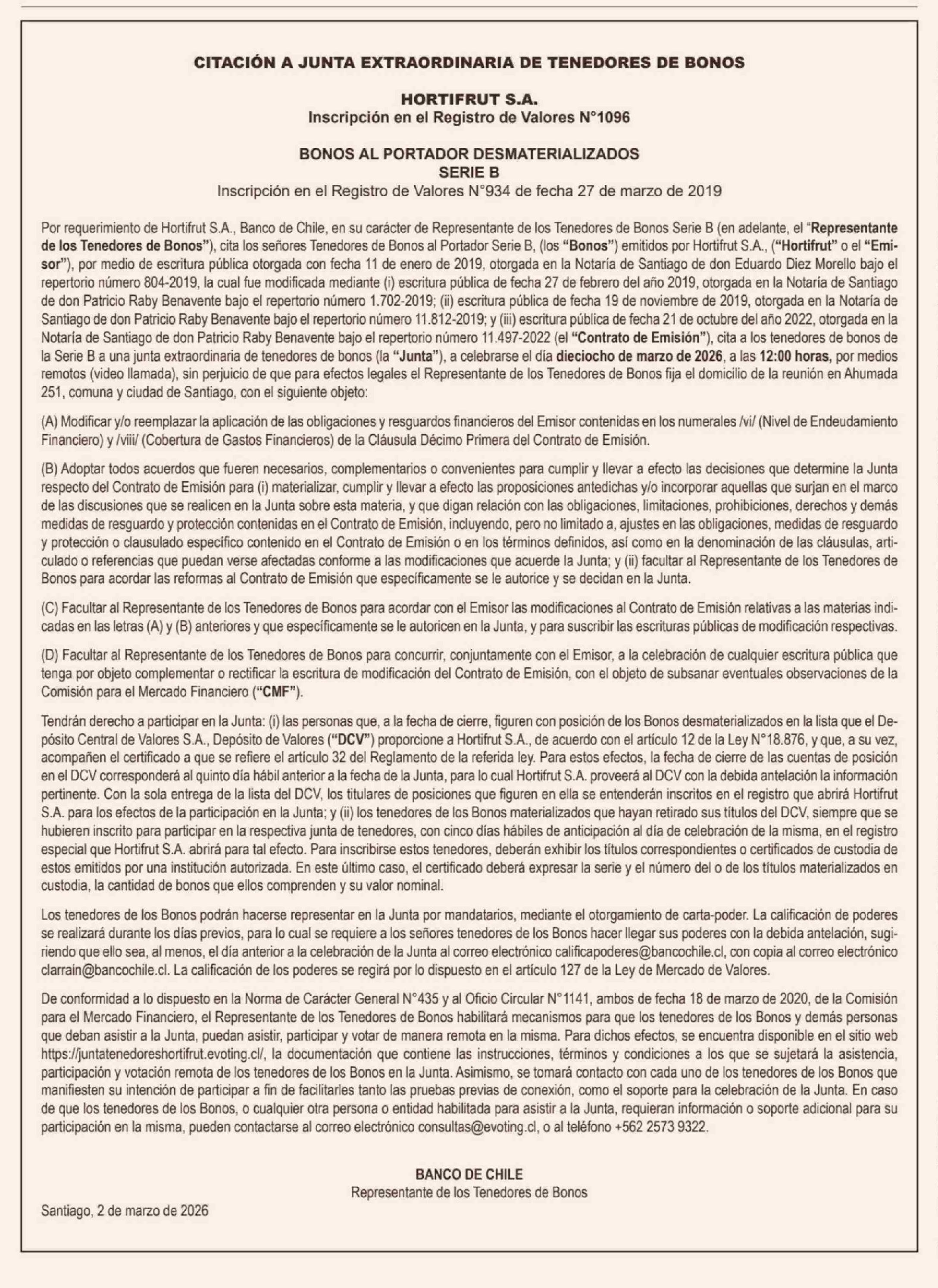 Extractos: CITACIÓN A JUNTA EXTRAORDINARIA DE TENEDORES DE BONOS