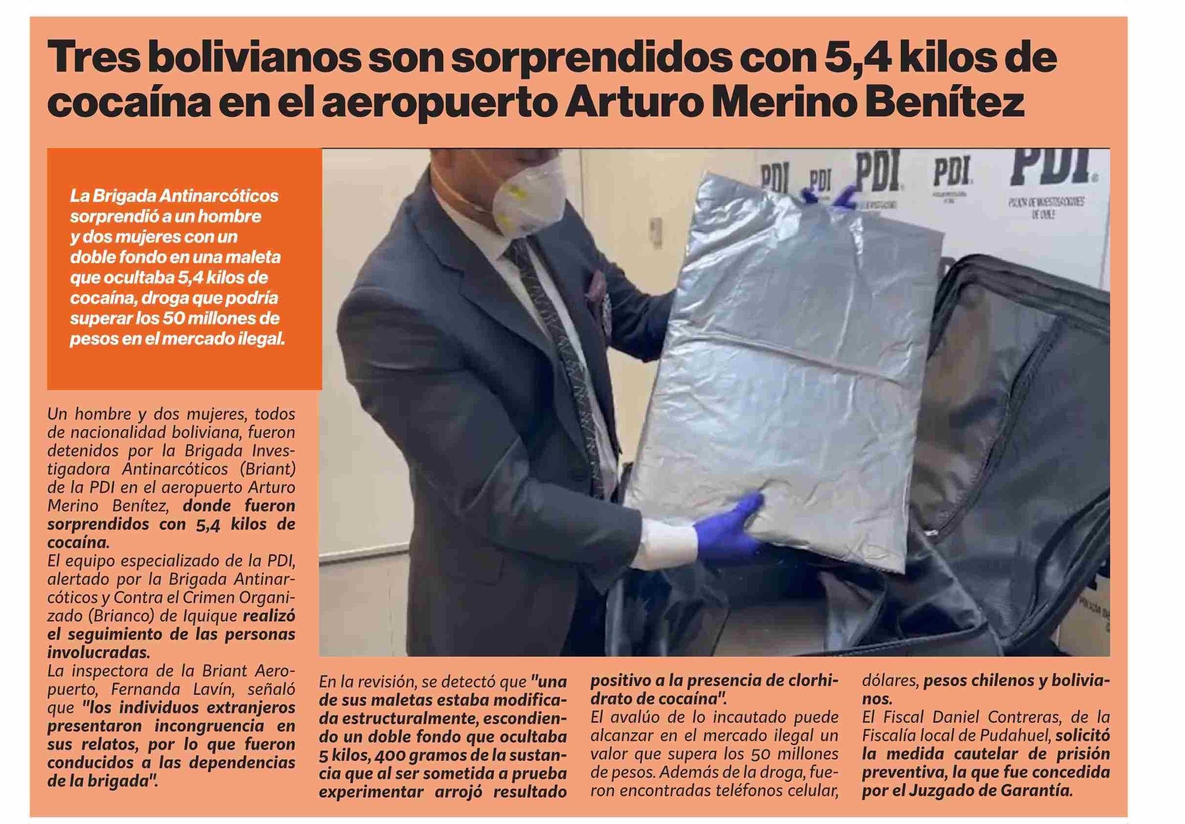 Tres bolivianos son sorprendidos con 5,4 kilos de cocaína en el aeropuerto Arturo Merino Benítez 19-02-2026 Puranoticia.cl |