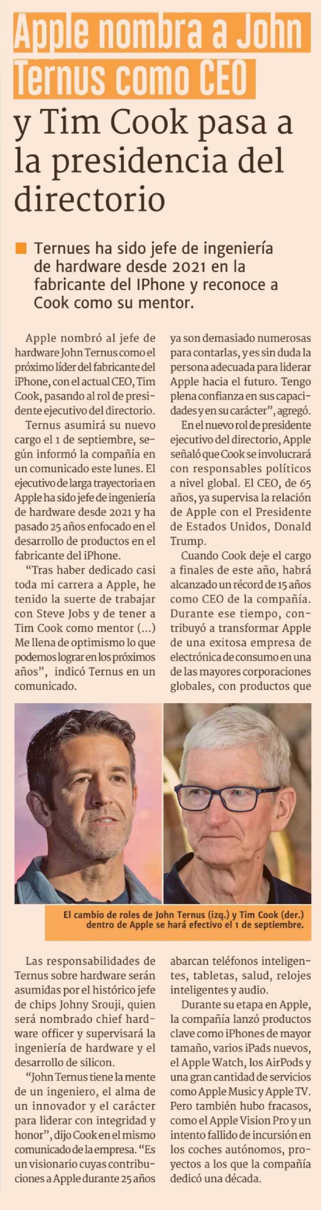 Título: Apple nombra a John Ternus como CEO y Tim Cook pasa a la presidencia del directorio