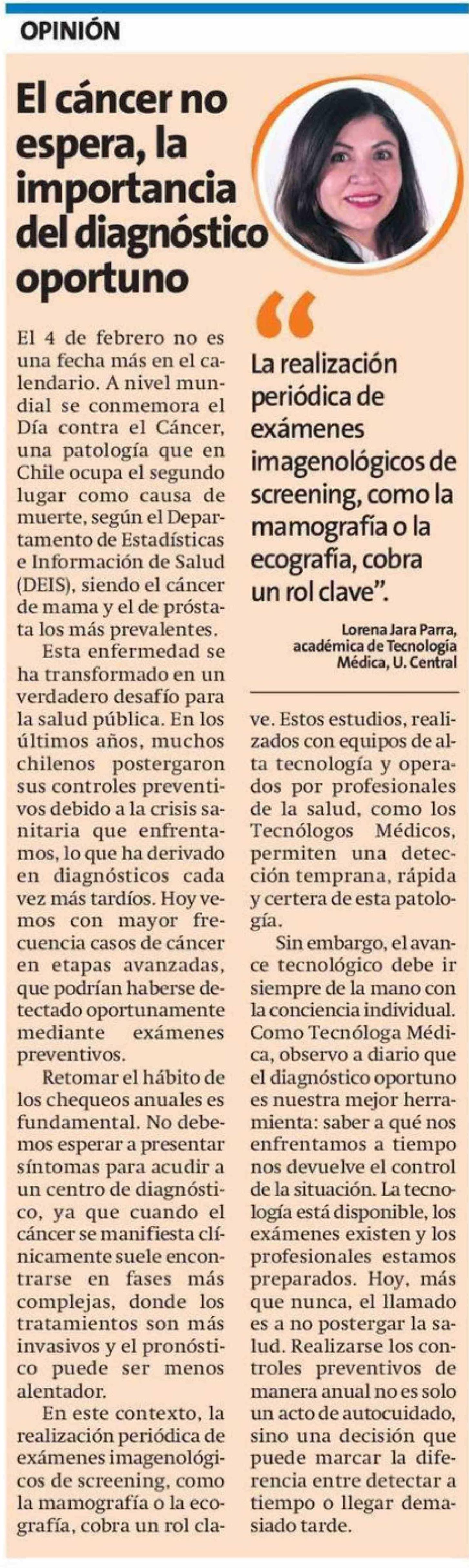 Columnas de Opinión: El cáncer no espera, la importancia del diagnóstico oportuno 03-02-2026 La Estrella de Iquique |