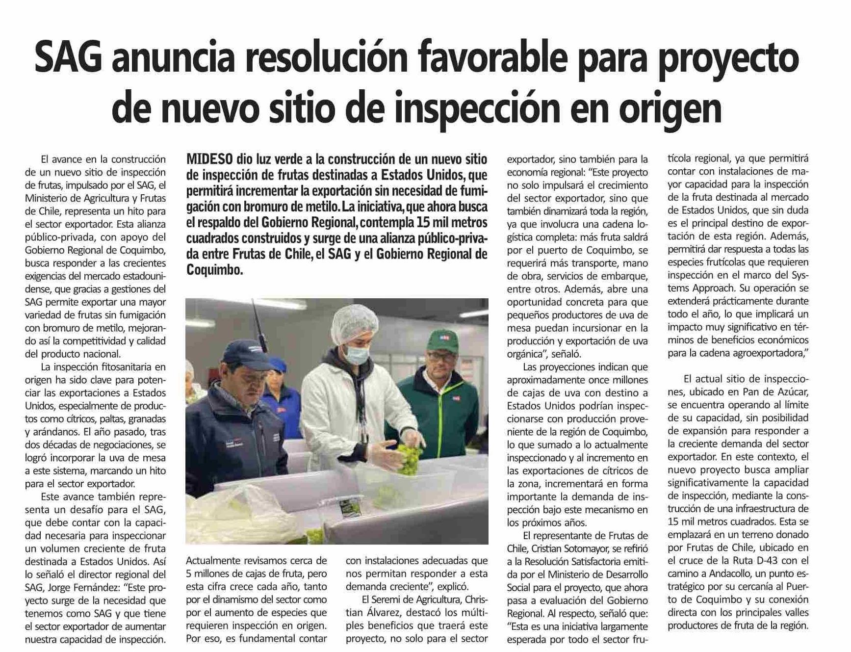 | Título: | SAG anuncia resolución favorable para proyecto de nuevo sitio de inspección en origen |