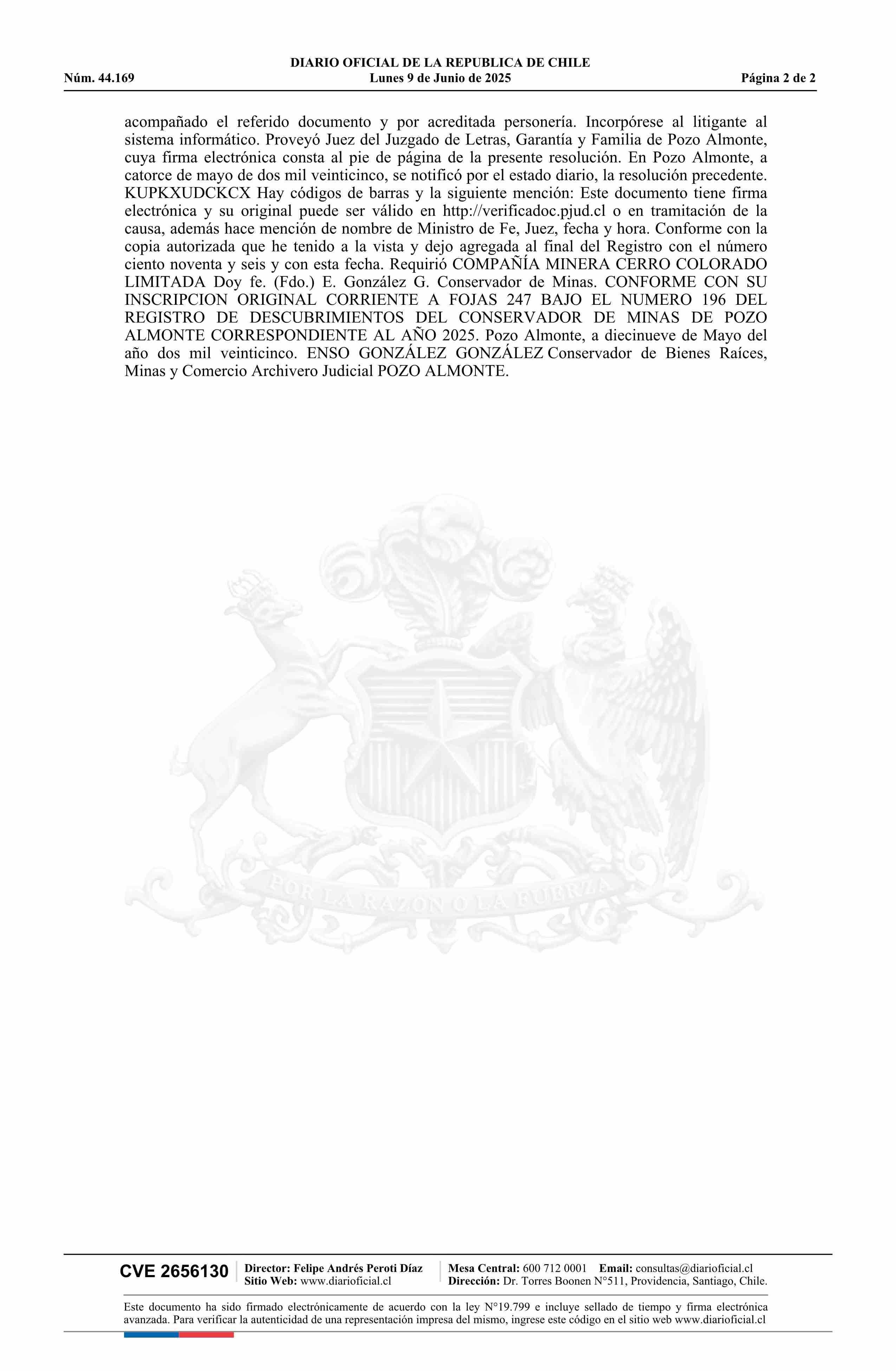 CARO 1 / Compañía Minera Cerro Colorado Limitada 09-06-2025 DIARIO OFICIAL CHILE - BOLETÍN OFICIAL DE MINERÍA |