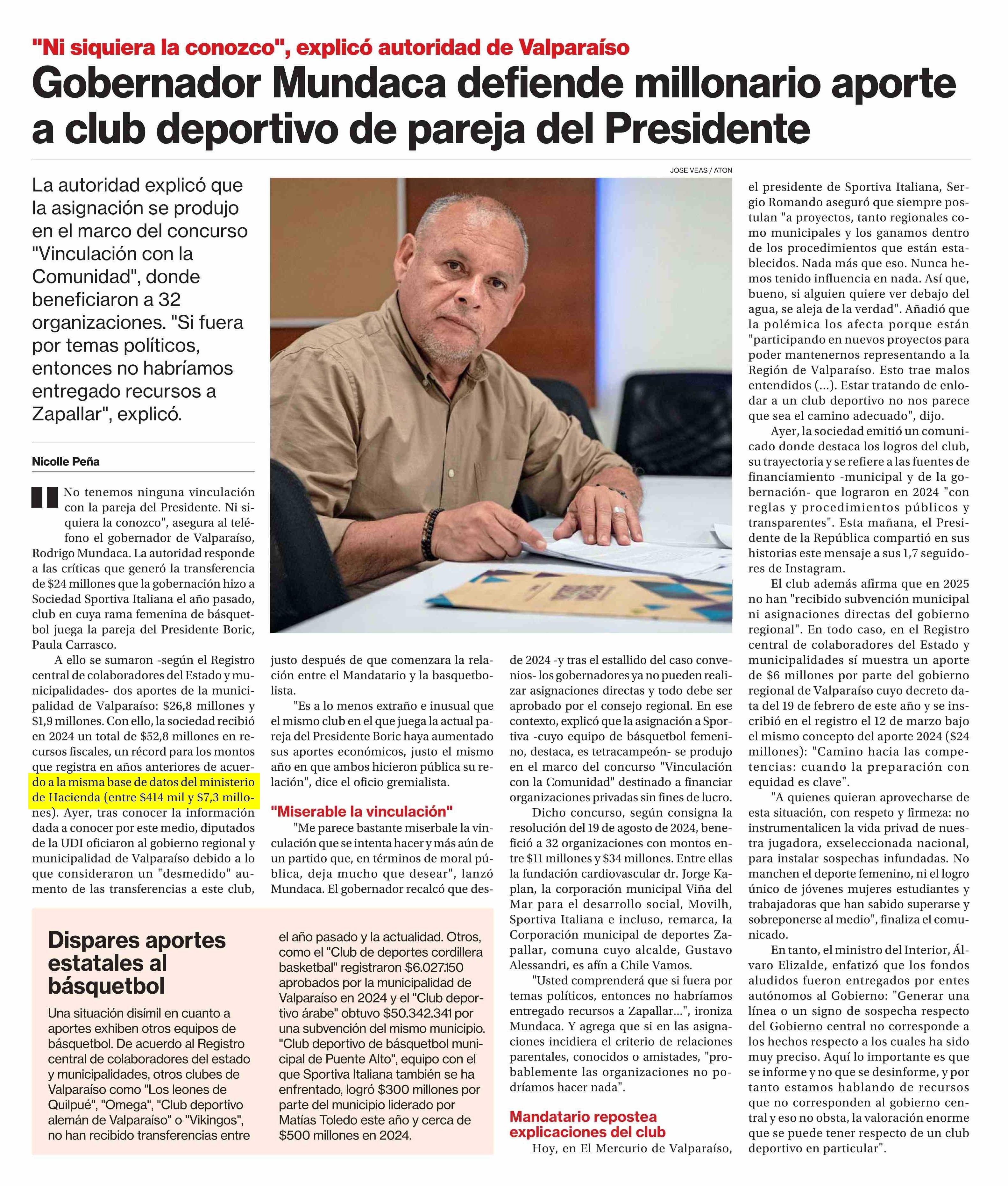 Título: Gobernador Mundaca defiende millonario aporte a club deportivo de pareja del Presidente