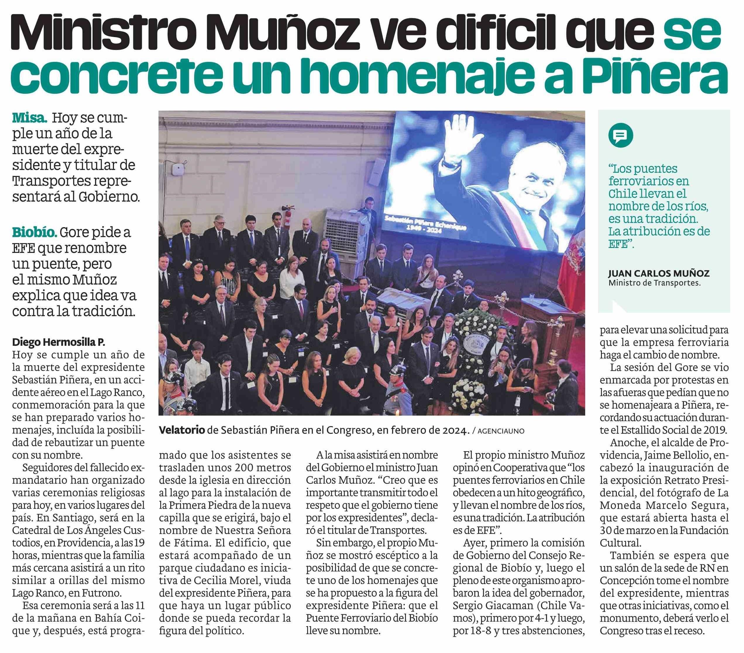 Ministro Muñoz ve difícil que se concrete un homenaje a Piñera 06-02-2025 Publimetro |