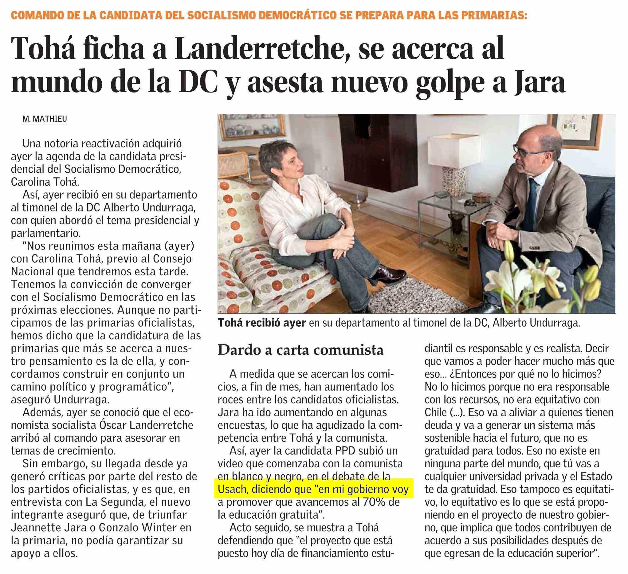 Tohá ficha a Landerretche, se acerca al mundo de la DC y asesta nuevo golpe a Jara 04-06-2025 El Mercurio |