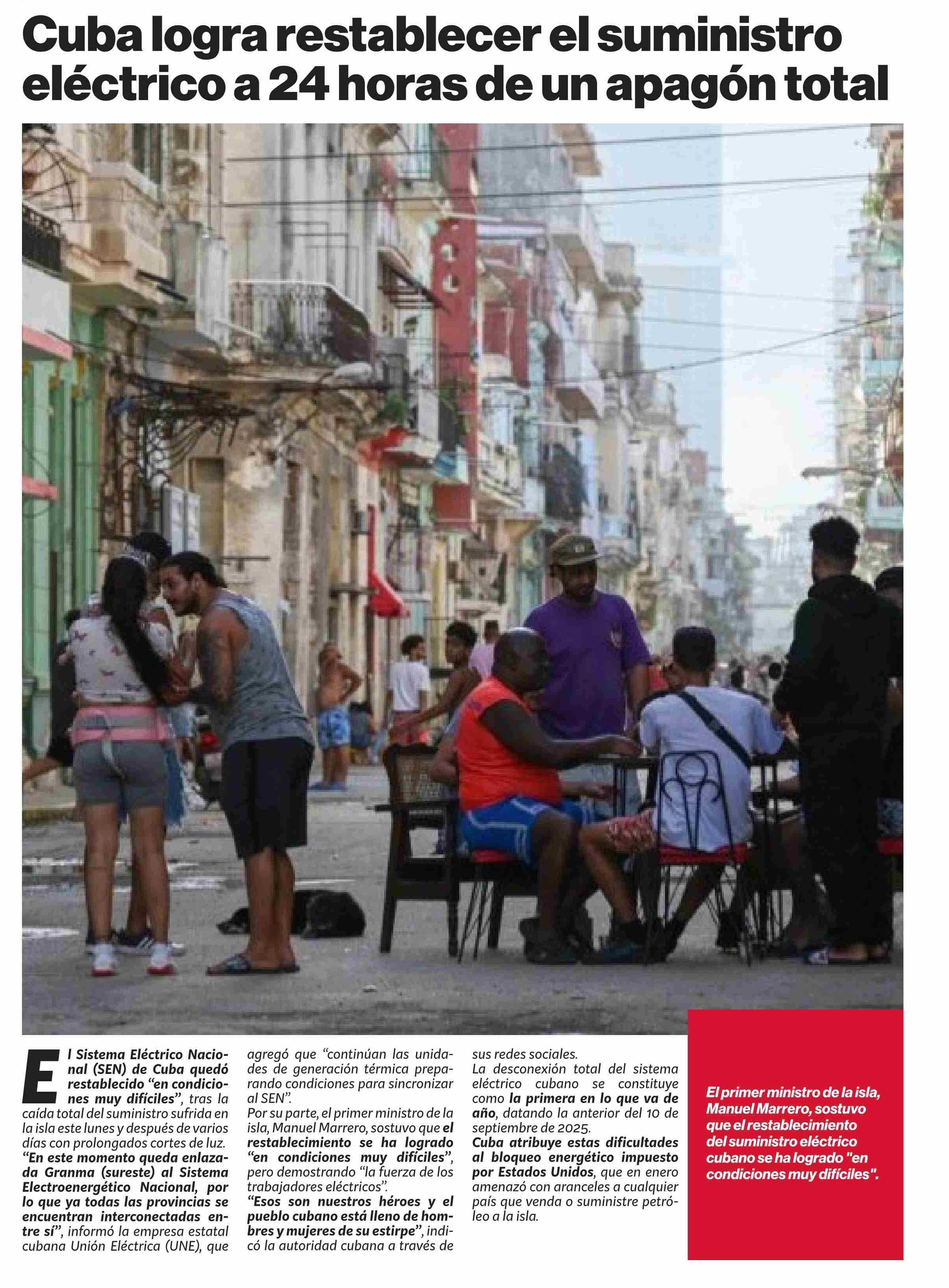 | Título: | Cuba logra restablecer el suministro eléctrico a 24 horas de un apagón total |