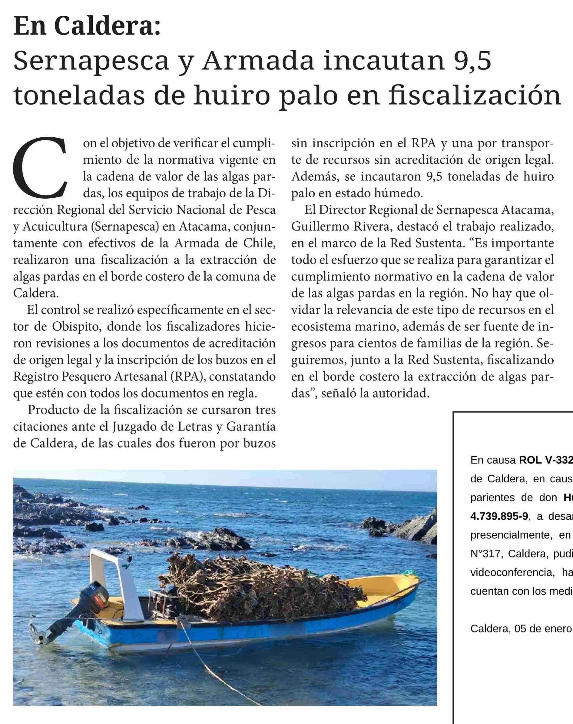 Título: Sernapesca y Armada incautan 9,5 toneladas de huiro palo en fiscalización