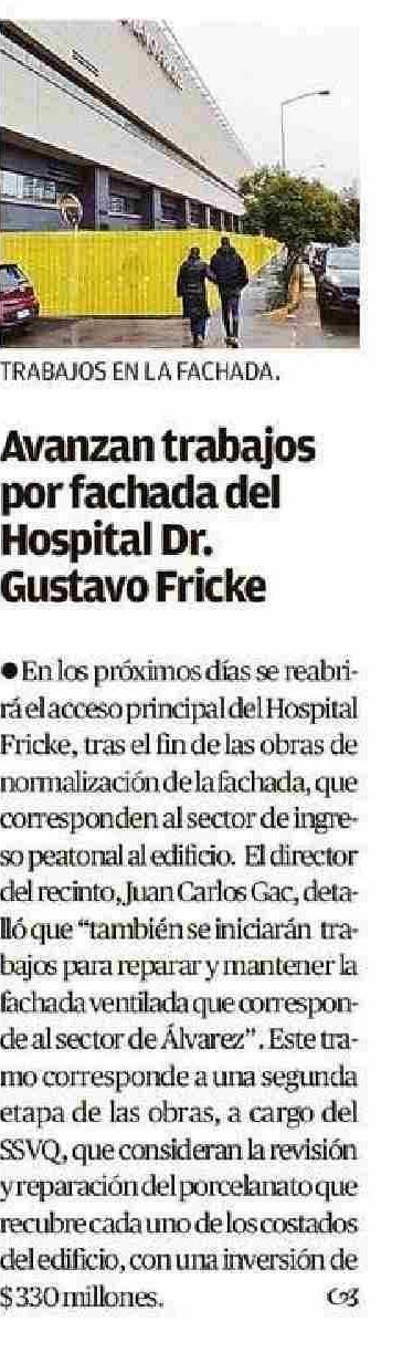 Avanzan trabajos por fachada del Hospital Dr. Gustavo Fricke 31-05-2025 El Mercurio de Valparaíso |