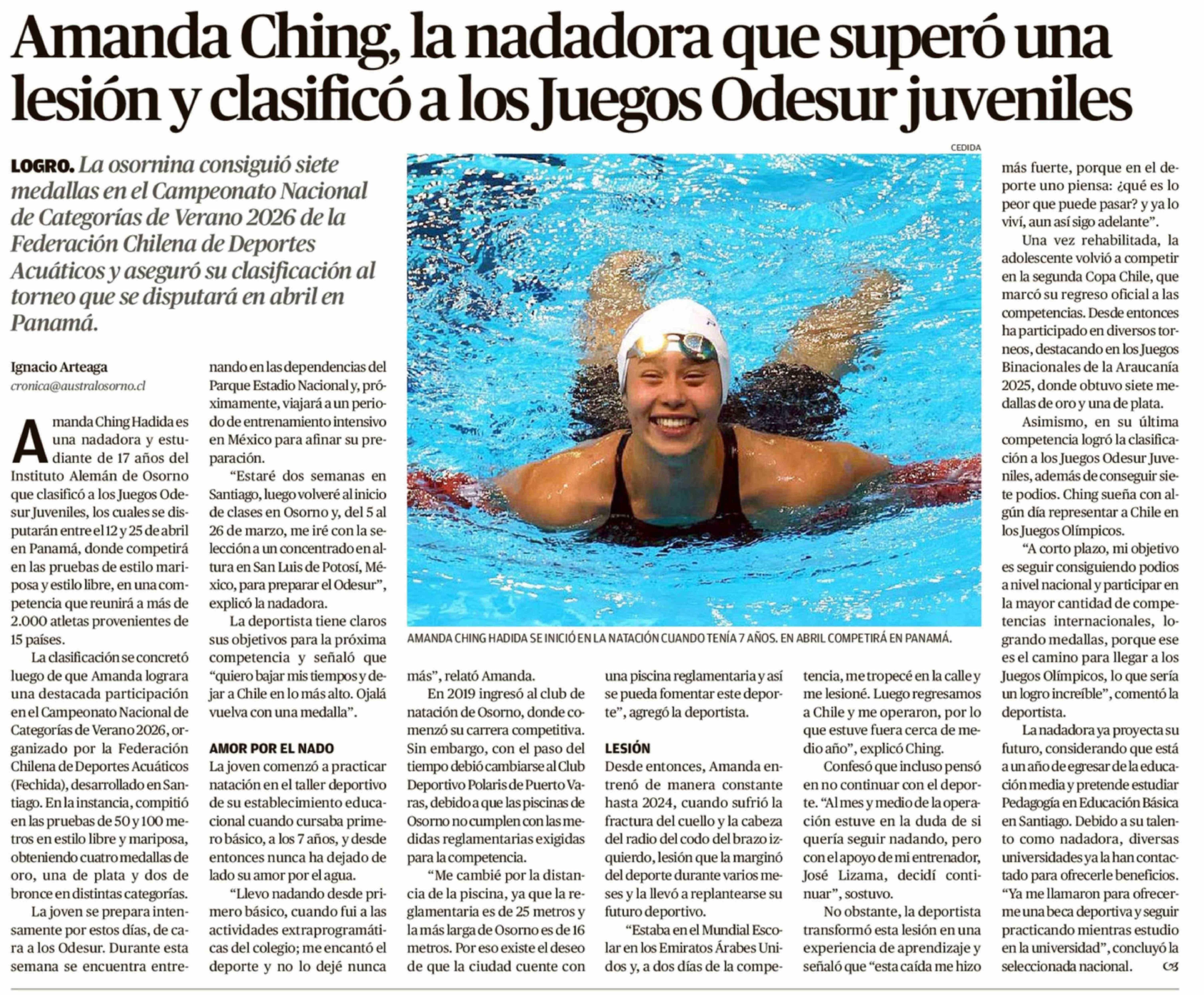 Amanda Ching, la nadadora que superó una lesión y clasificó a los Juegos Odesur juveniles 11-02-2026 El Austral de Osorno |