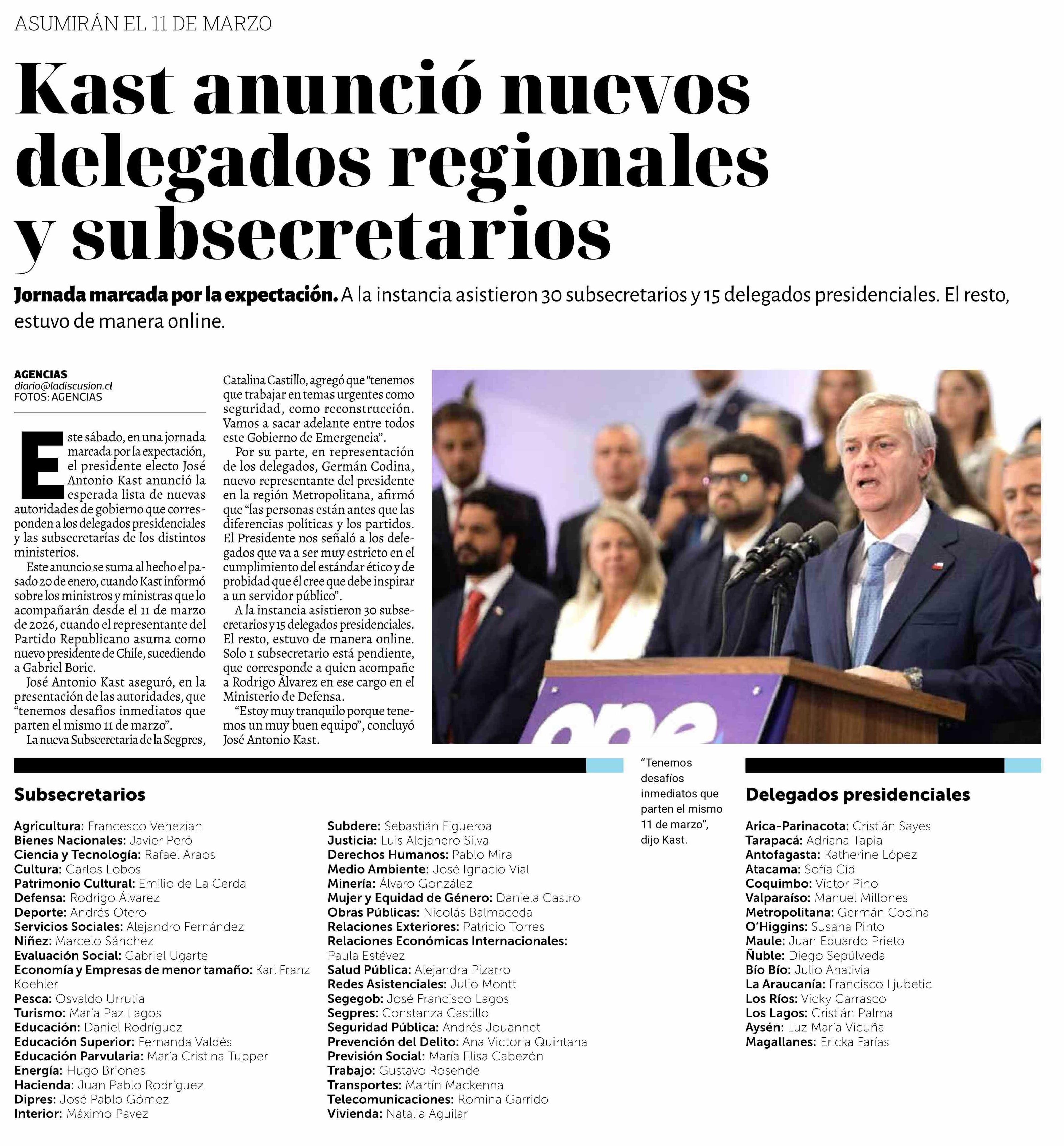 Kast anunció nuevos delegados regionales y subsecretarios 08-02-2026 La Discusión |