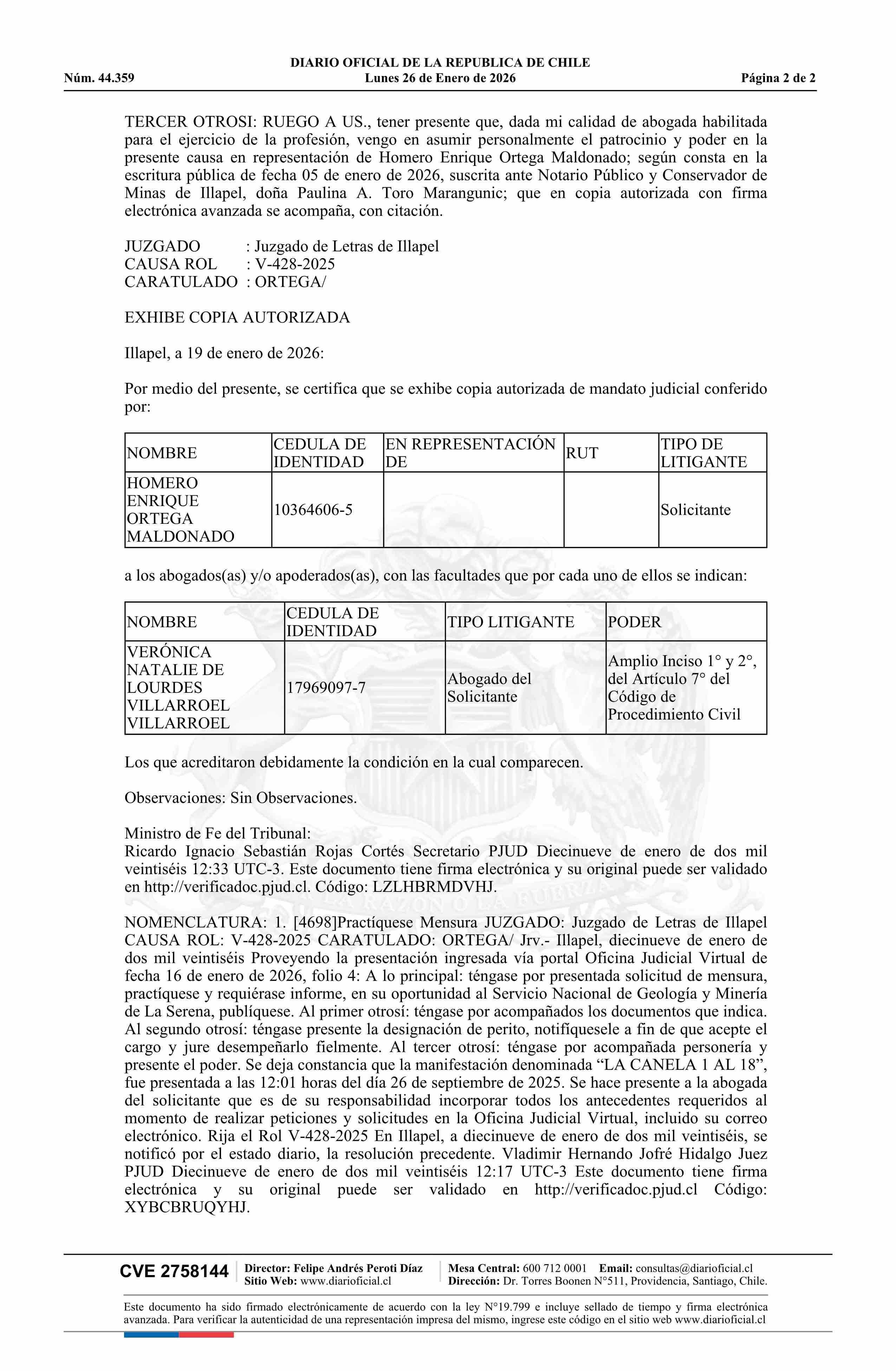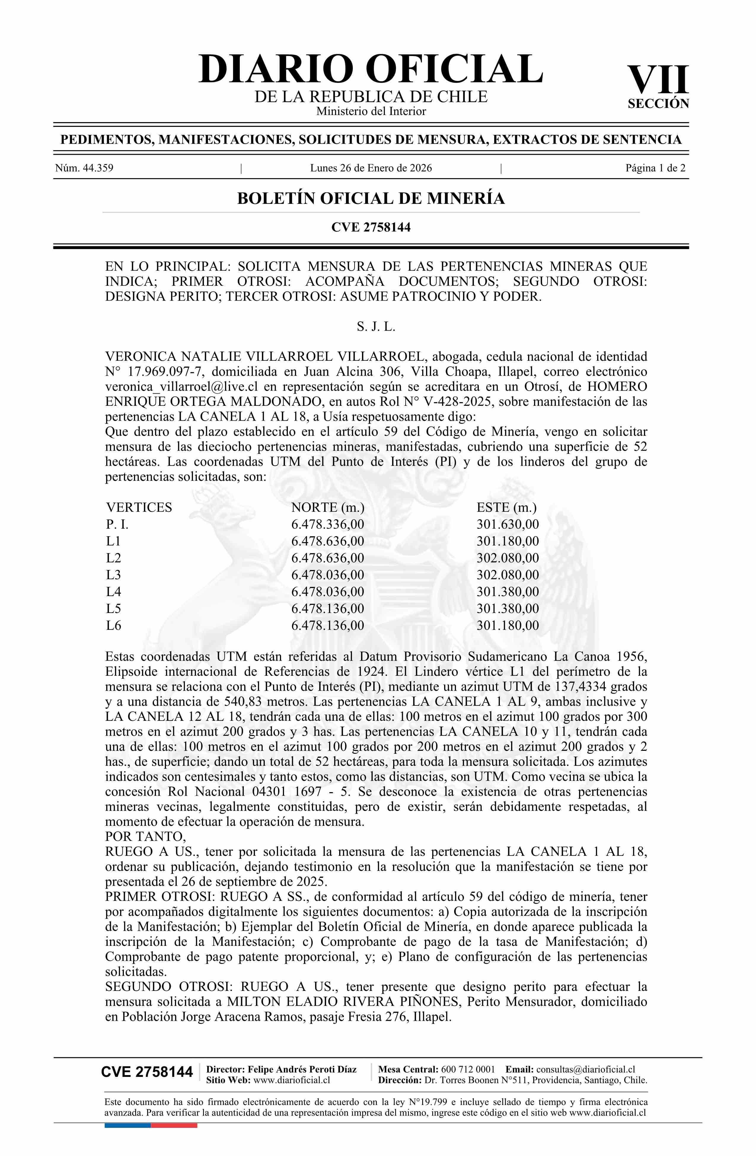 LA CANELA 1 AL 18 / Ortega Maldonado Homero Enrique 26-01-2026 DIARIO OFICIAL CHILE - BOLETÍN OFICIAL DE MINERÍA |