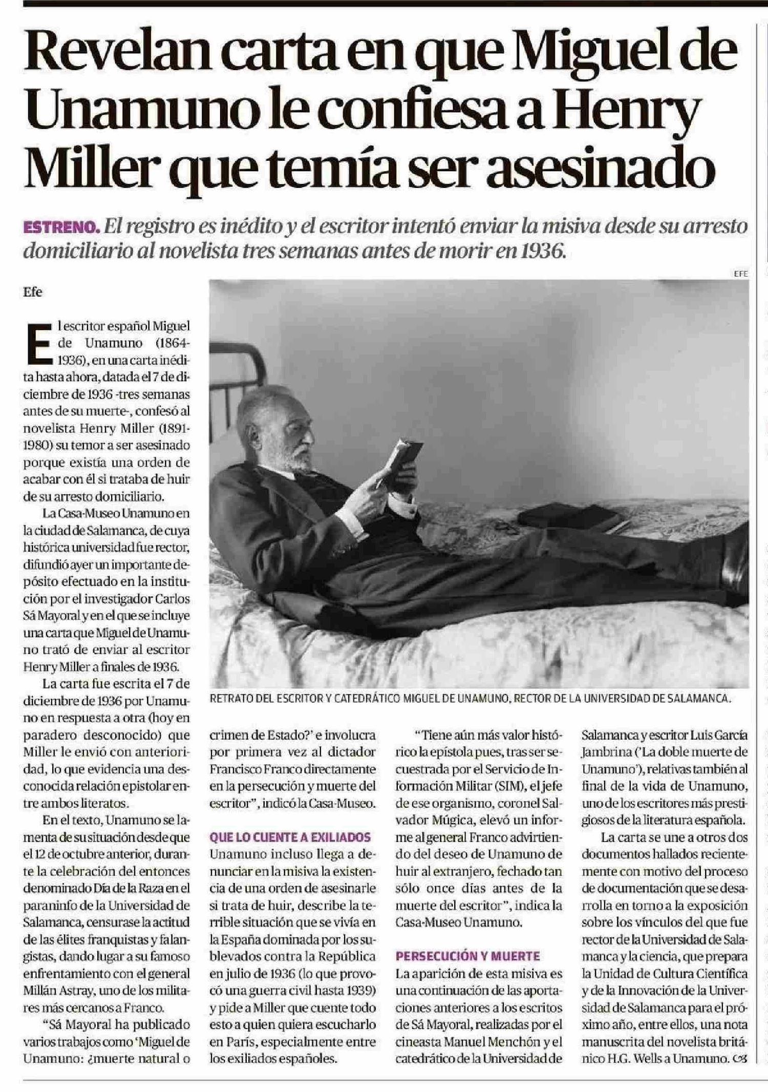 Revelan carta en que Miguel de Unamuno le confiesa a Henry Miller que temía ser asesinado 07-06-2025 El Mercurio de Valparaíso |
