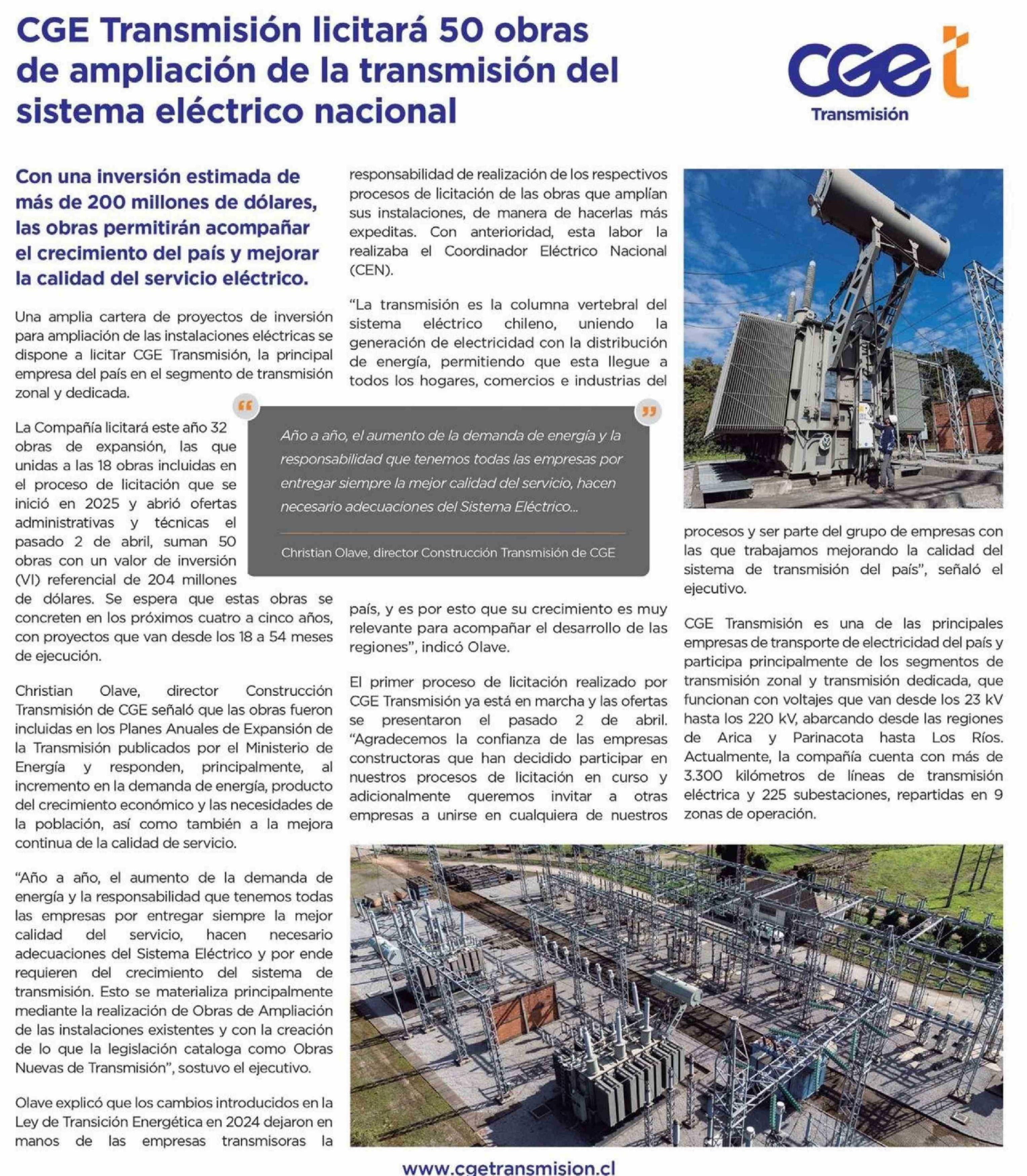 | Título: | CGE Transmisión licitará 50 obras de ampliación de la transmisión del sistema eléctrico nacional |