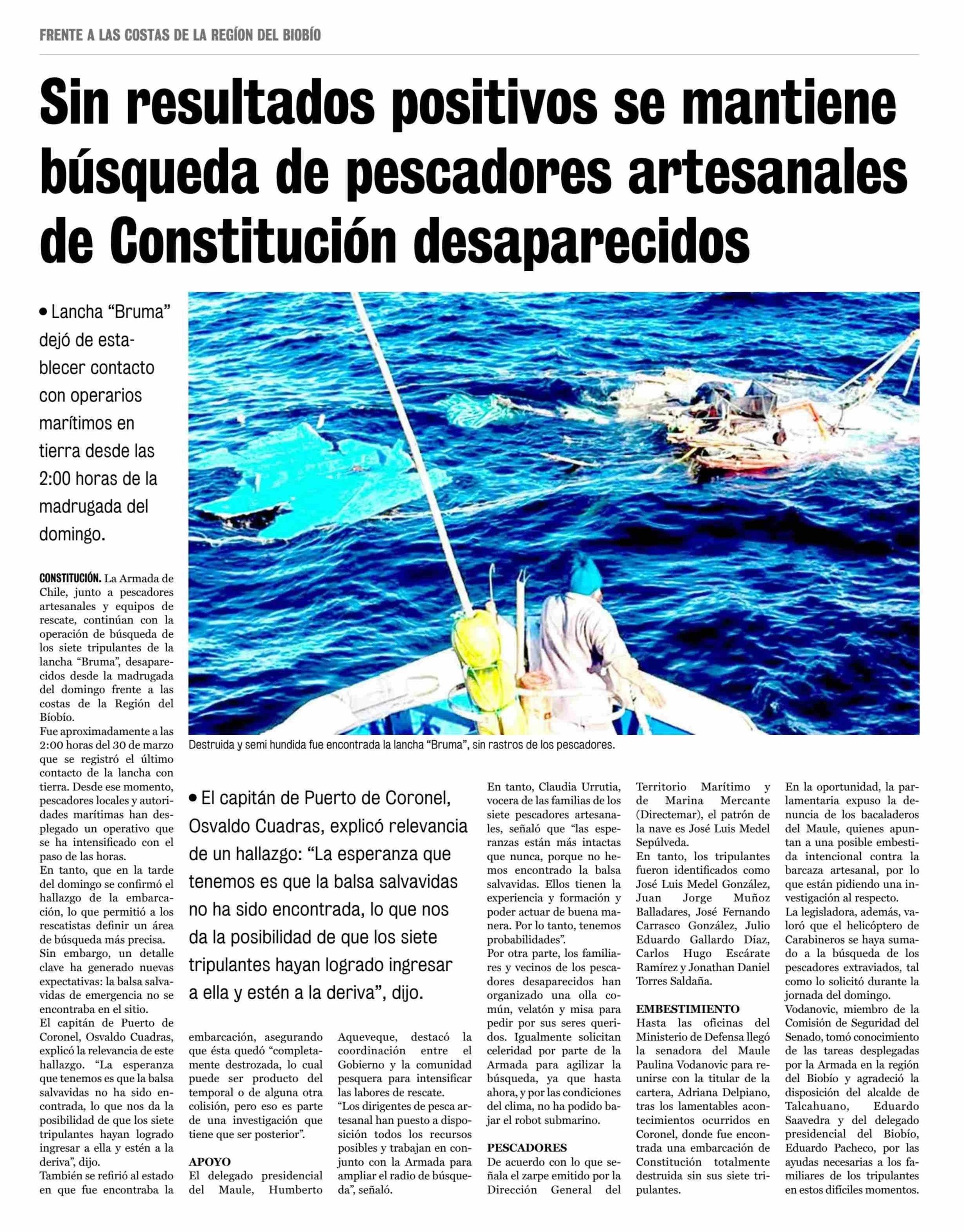 Sin resultados positivos se mantiene búsqueda de pescadores artesanales de Constitución desaparecidos 01-04-2025 La Prensa de Curicó |