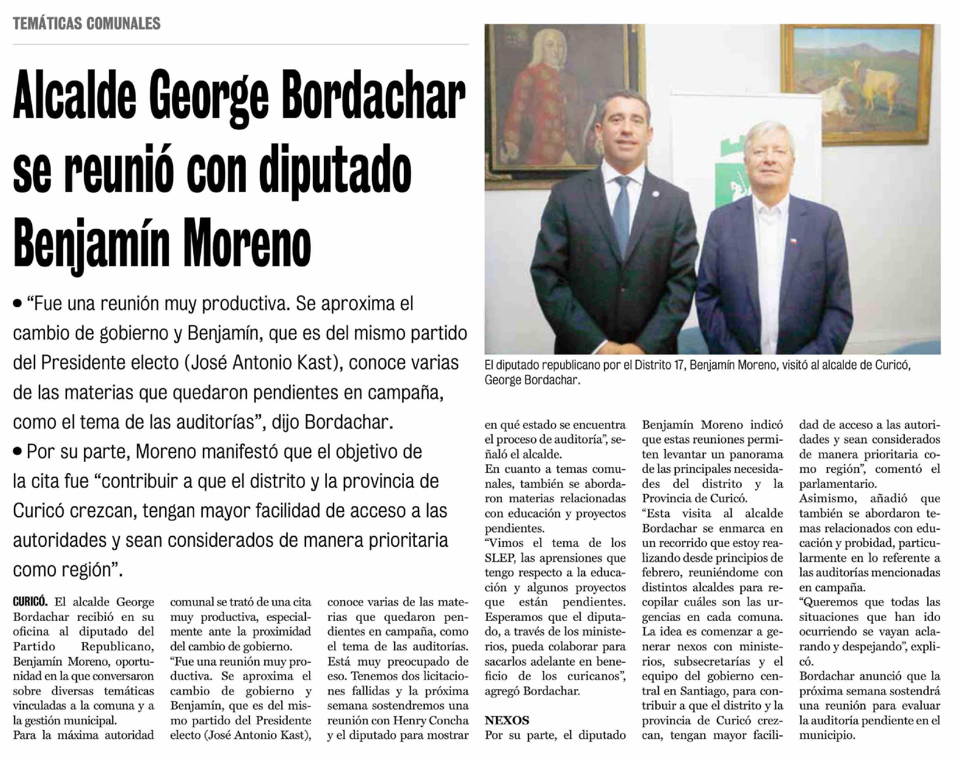 Alcalde George Bordachar se reunió con diputado Benjamín Moreno 22-02-2026 La Prensa de Curicó |