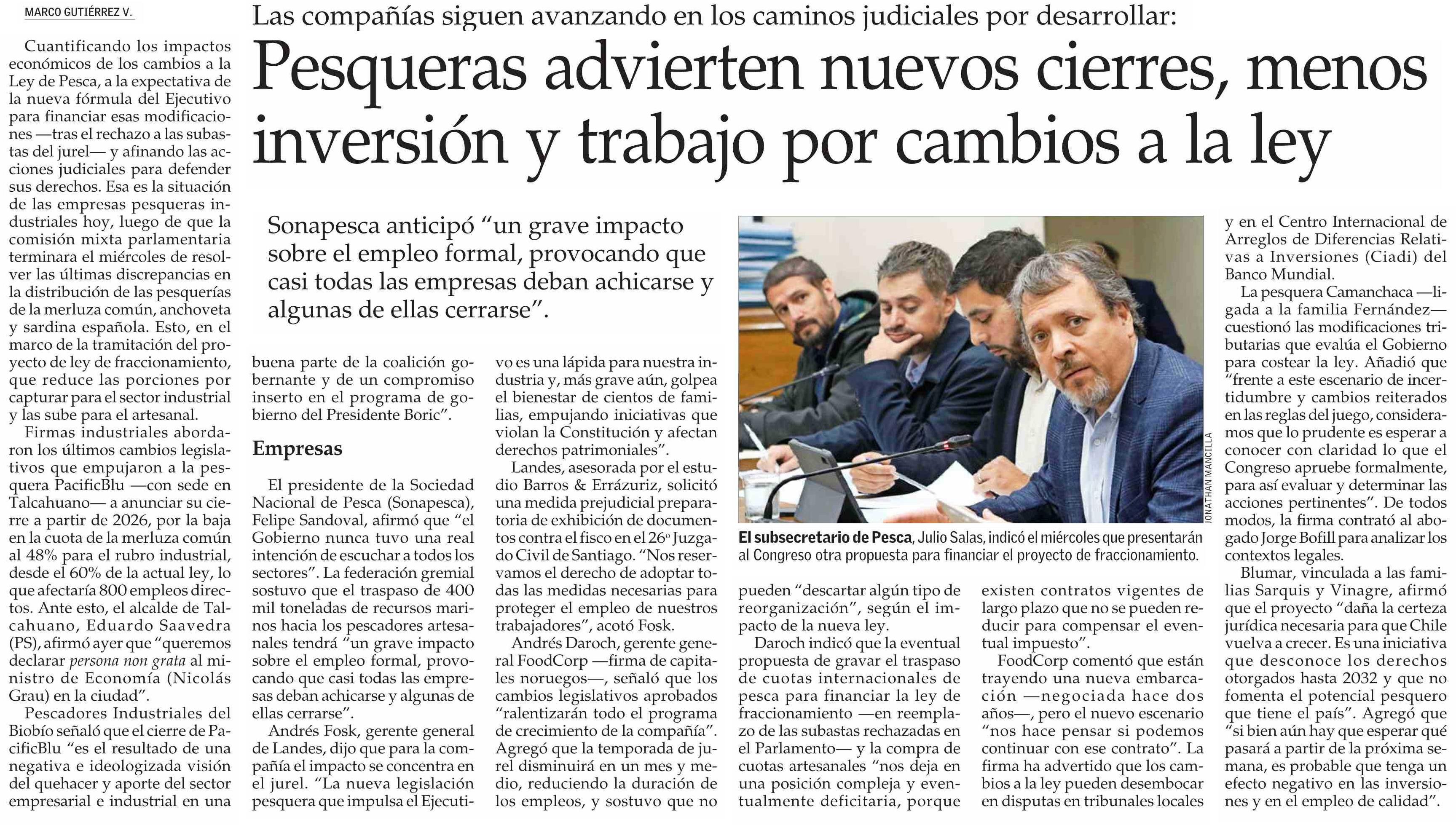 Pesqueras advierten nuevos cierres, menos inversión y trabajo por cambios a la ley 09-05-2025 El Mercurio |