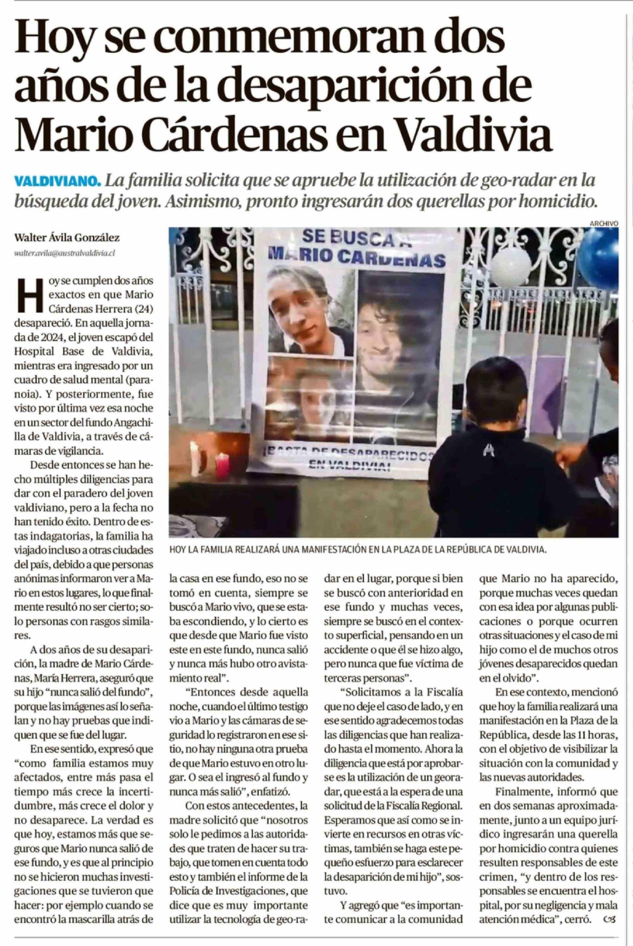 Título: Hoy se conmemoran dos años de la desaparición de Mario Cárdenas en Valdivia