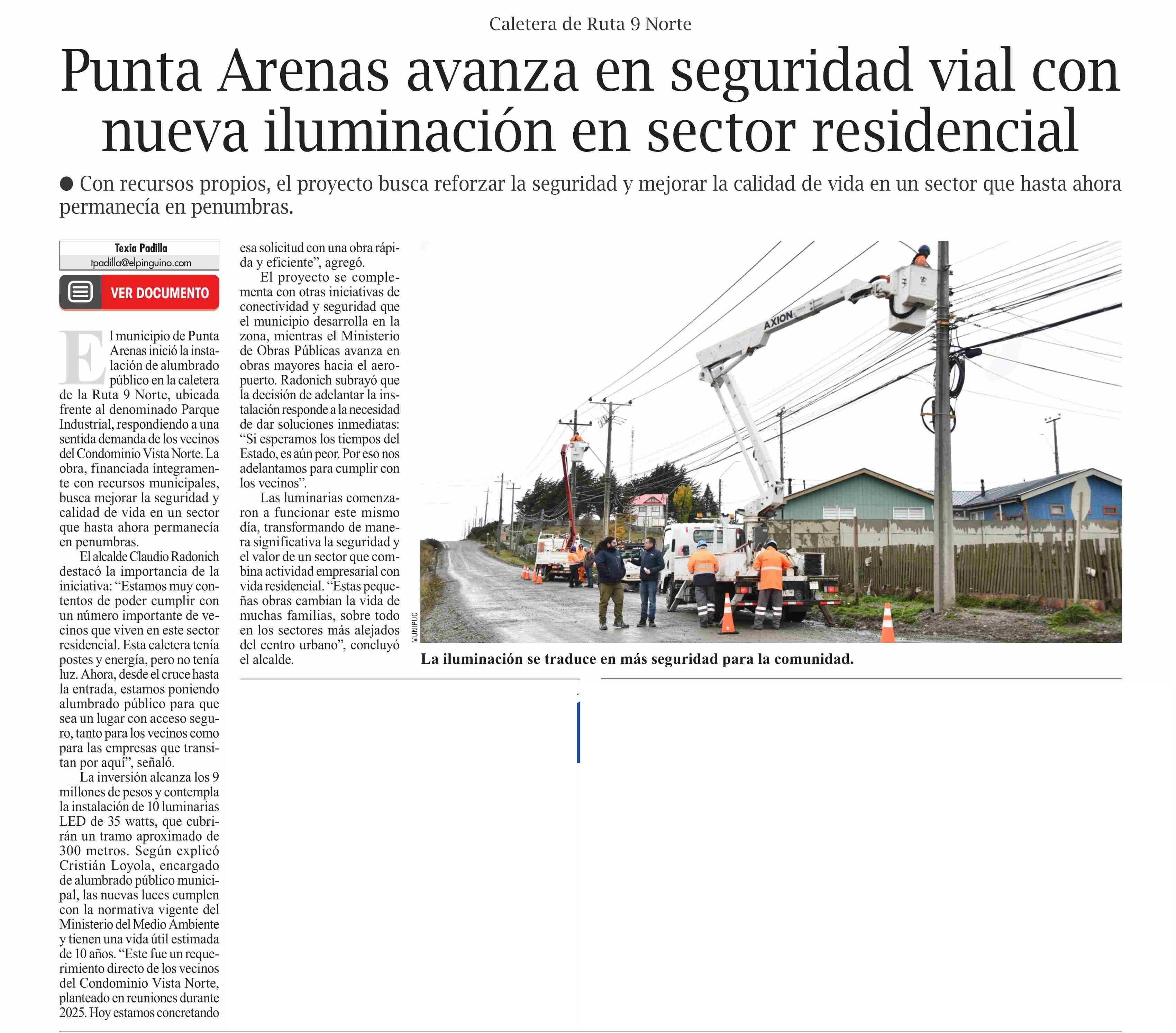 Título: Caletera de Kuta 9 Norte Punta Arenas avanza en seguridad vial con nueva iluminación en sector residencial