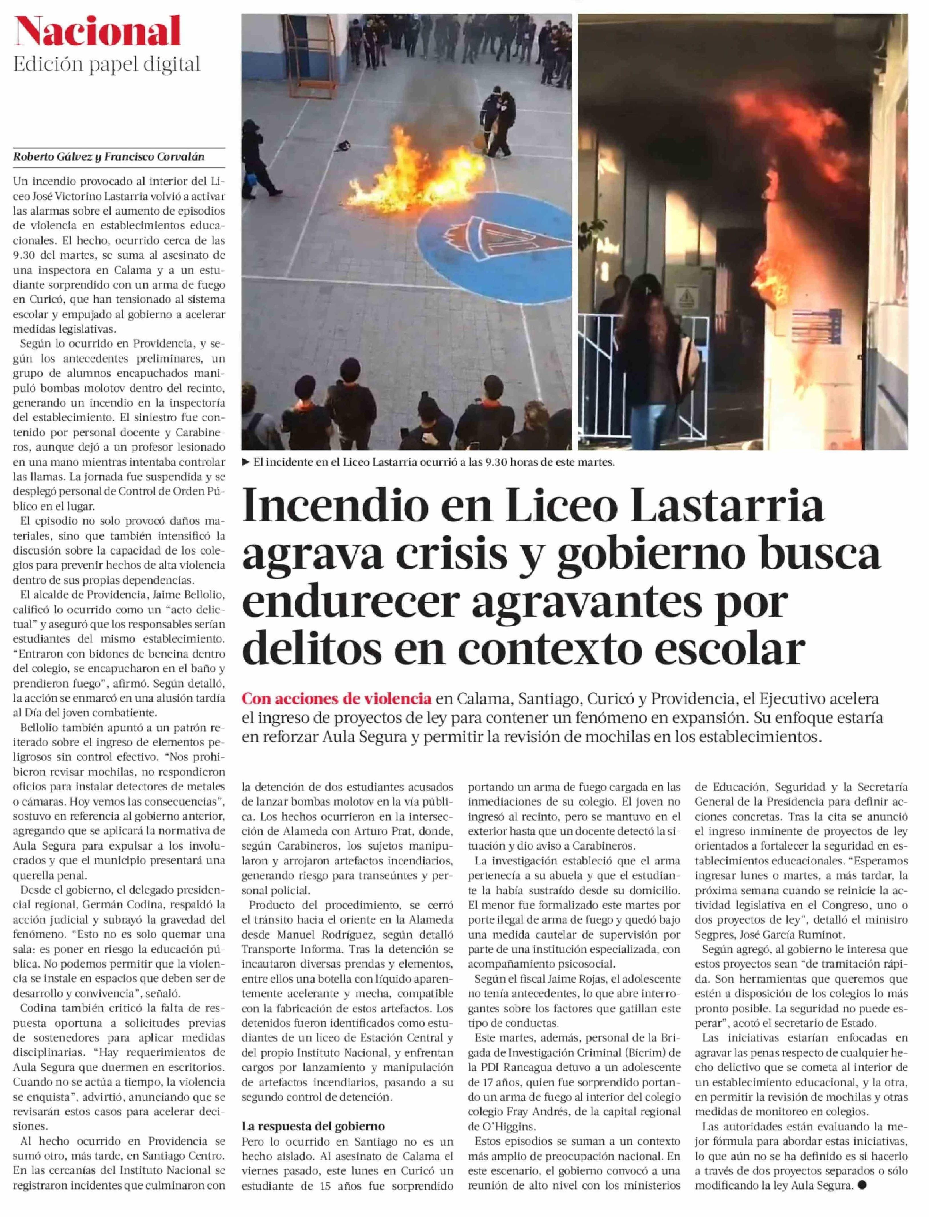 Título: Incendio en Liceo Lastarria agrava crisis y gobierno busca endurecer agravantes por delitos en contexto escolar