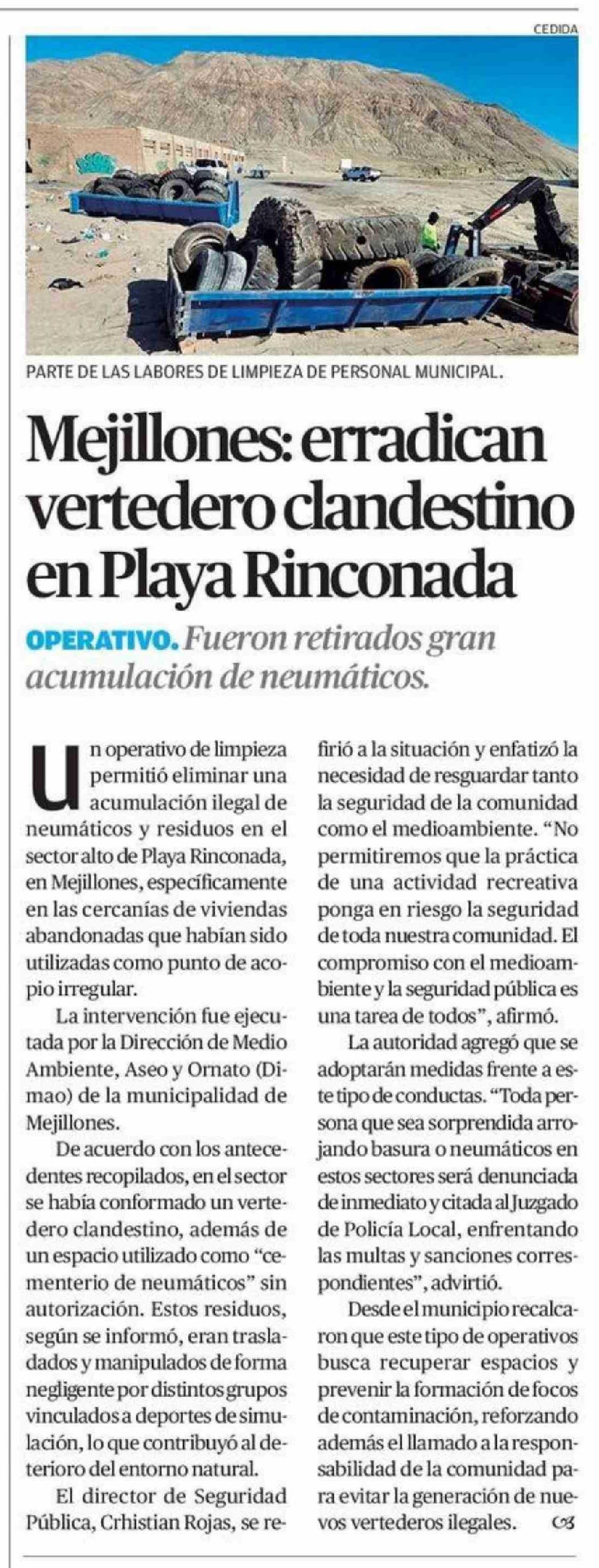 Mejillones: erradican vertedero clandestino en Playa Rinconada 23-04-2026 El Mercurio de Antofagasta |