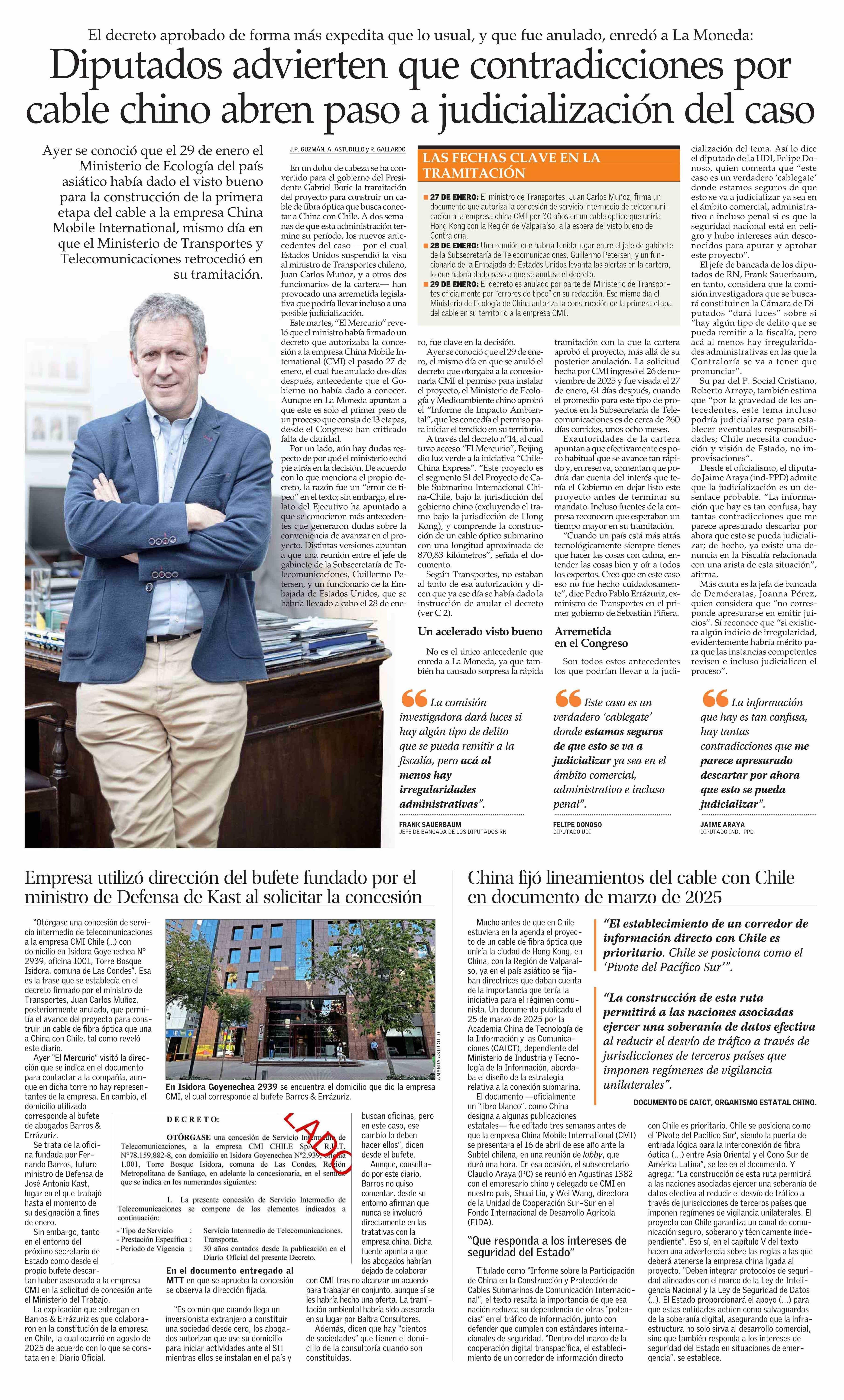 Diputados advierten que contradicciones por cable chino abren paso a judicialización del caso 26-02-2026 El Mercurio |