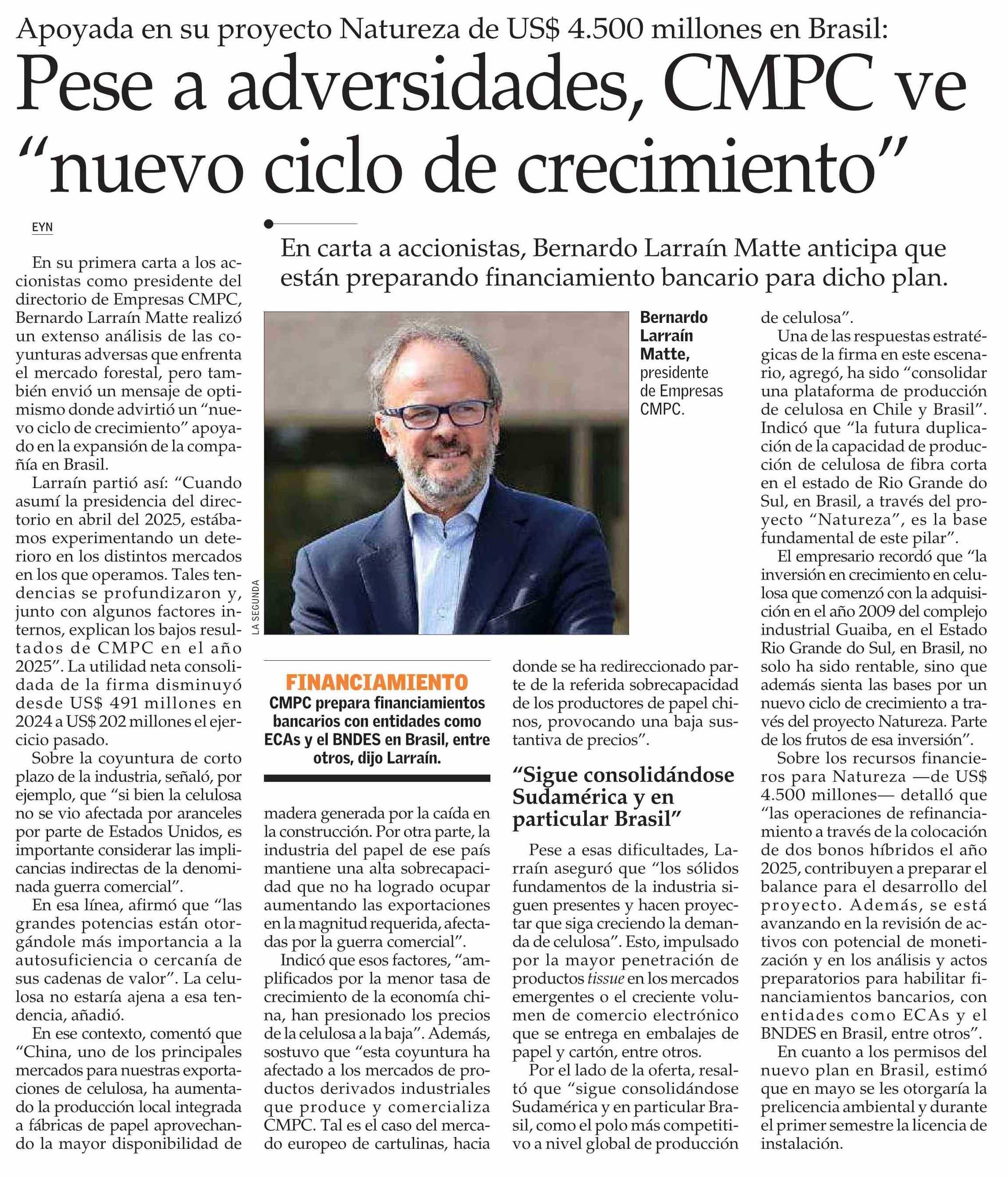 Pese a adversidades, CMPC ve “nuevo ciclo de crecimiento” 14-04-2026 El Mercurio |