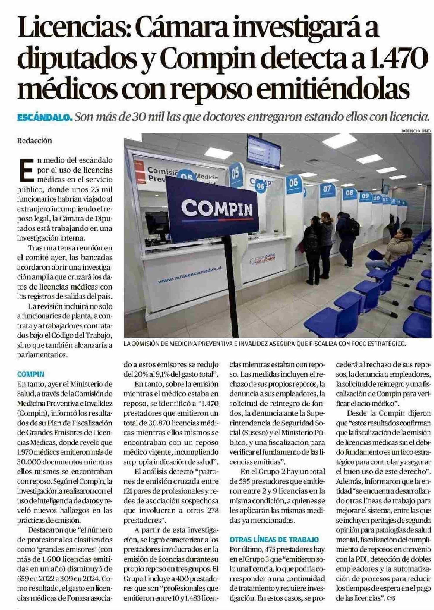| Título: | Licencias: Cámara investigará a diputados y Compin detecta a 1.470 médicos con reposo emitiéndolas |