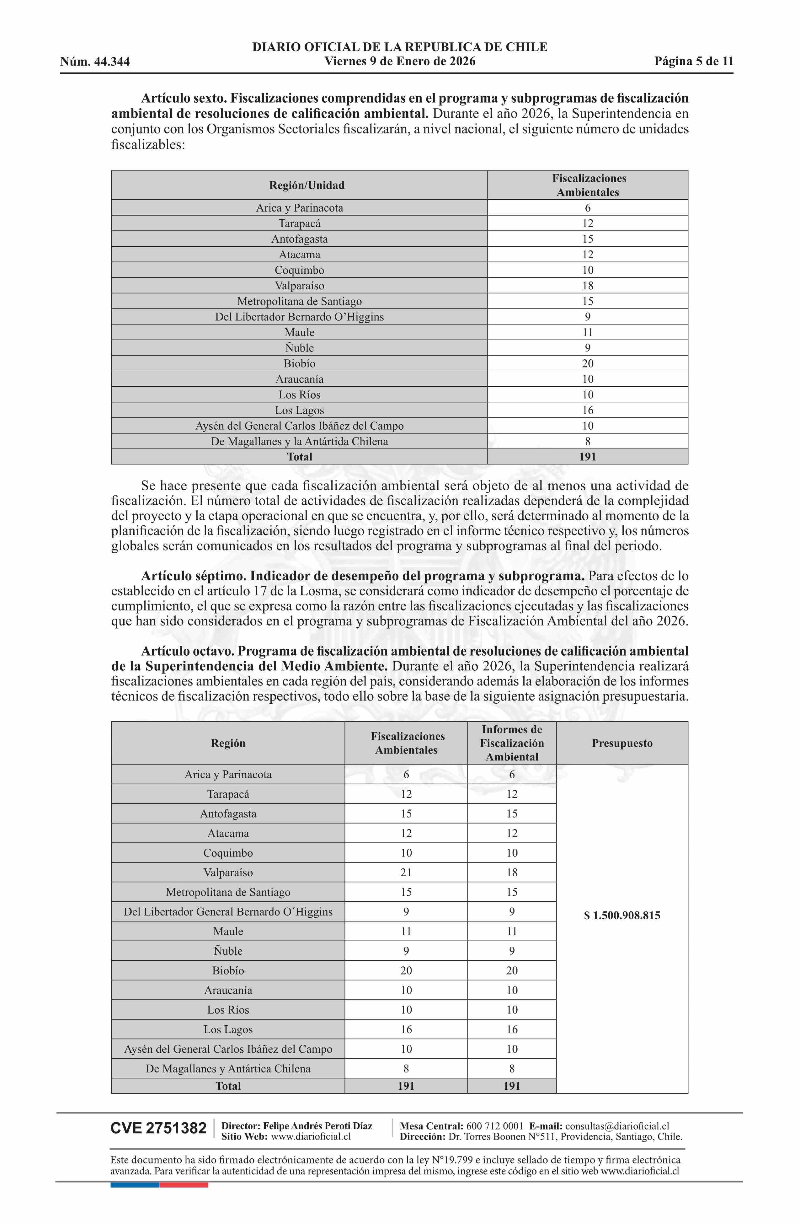 Resolución exenta número 2.999, de 2025.- Fija programa y subprogramas de fiscalización ambiental de resoluciones de calificación ambiental para el año 2026 09-01-2026 Diario Oficial Edición Electrónica |