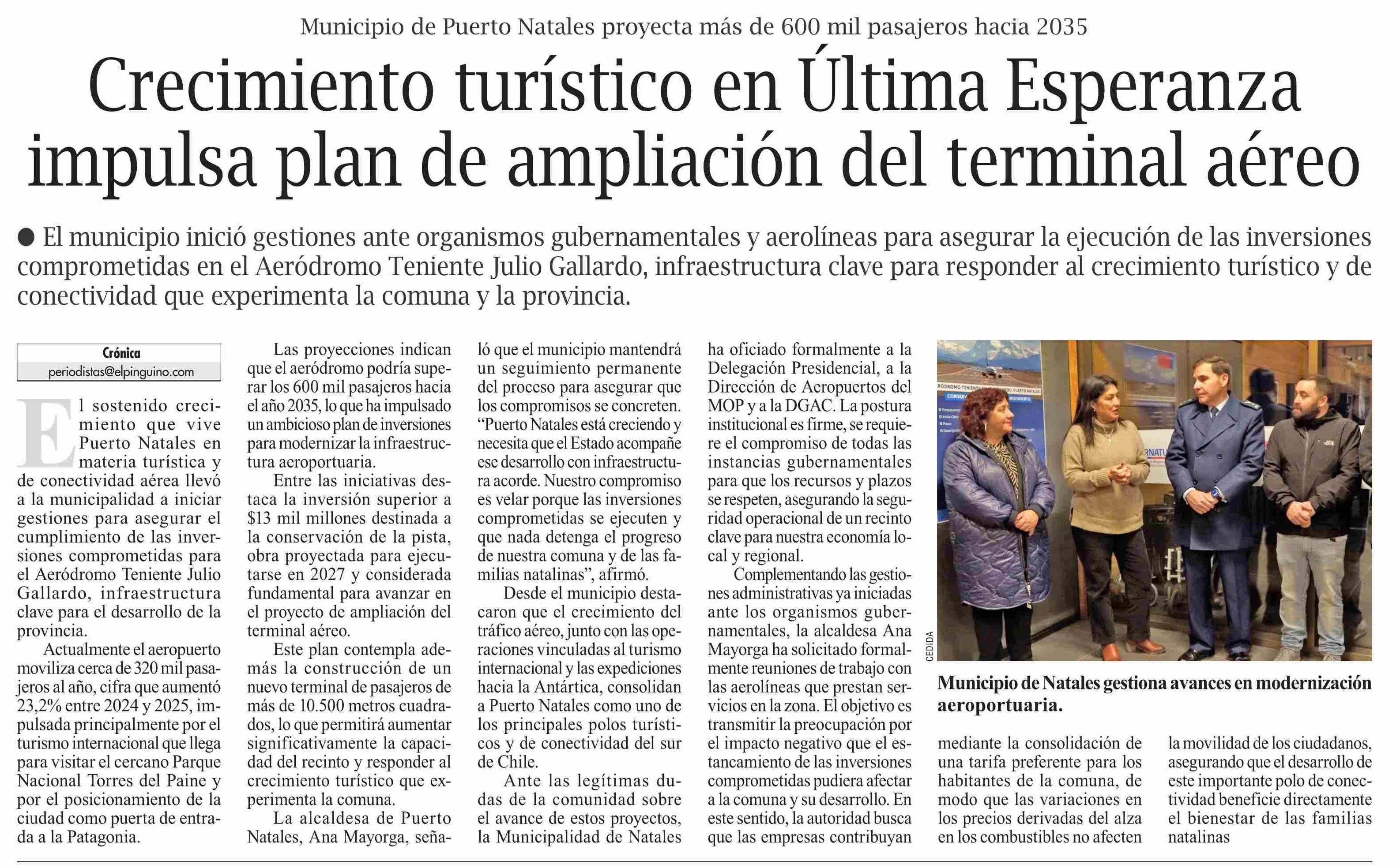 Crecimiento turístico en Última Esperanza impulsa plan de ampliación del terminal aéreo 13-04-2026 El Pingüino |