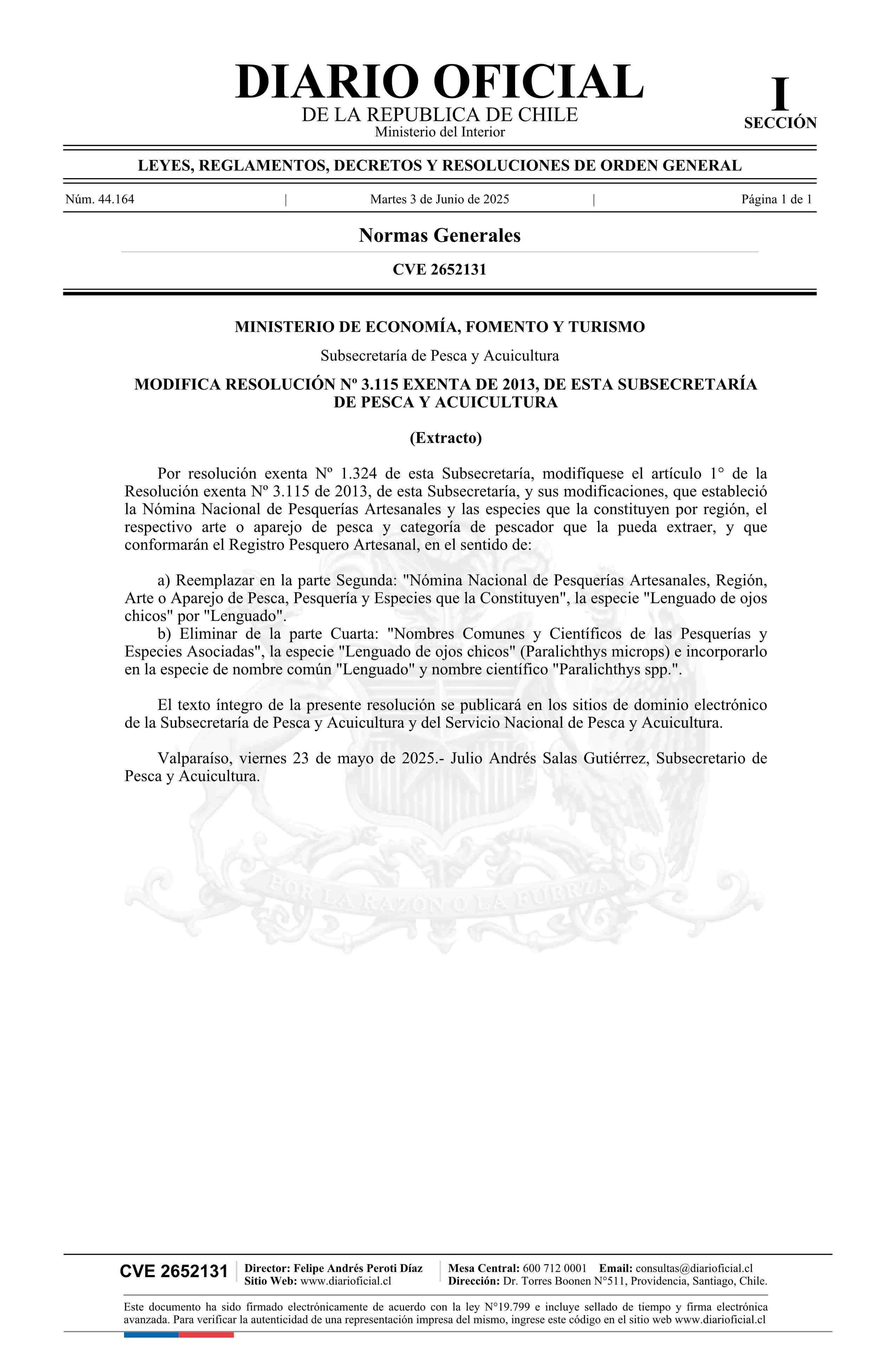 | Título: | Extracto de resolución exenta número 1.324, de 2025.- Modifica resolución N° 3.115 exenta, de 2013 |