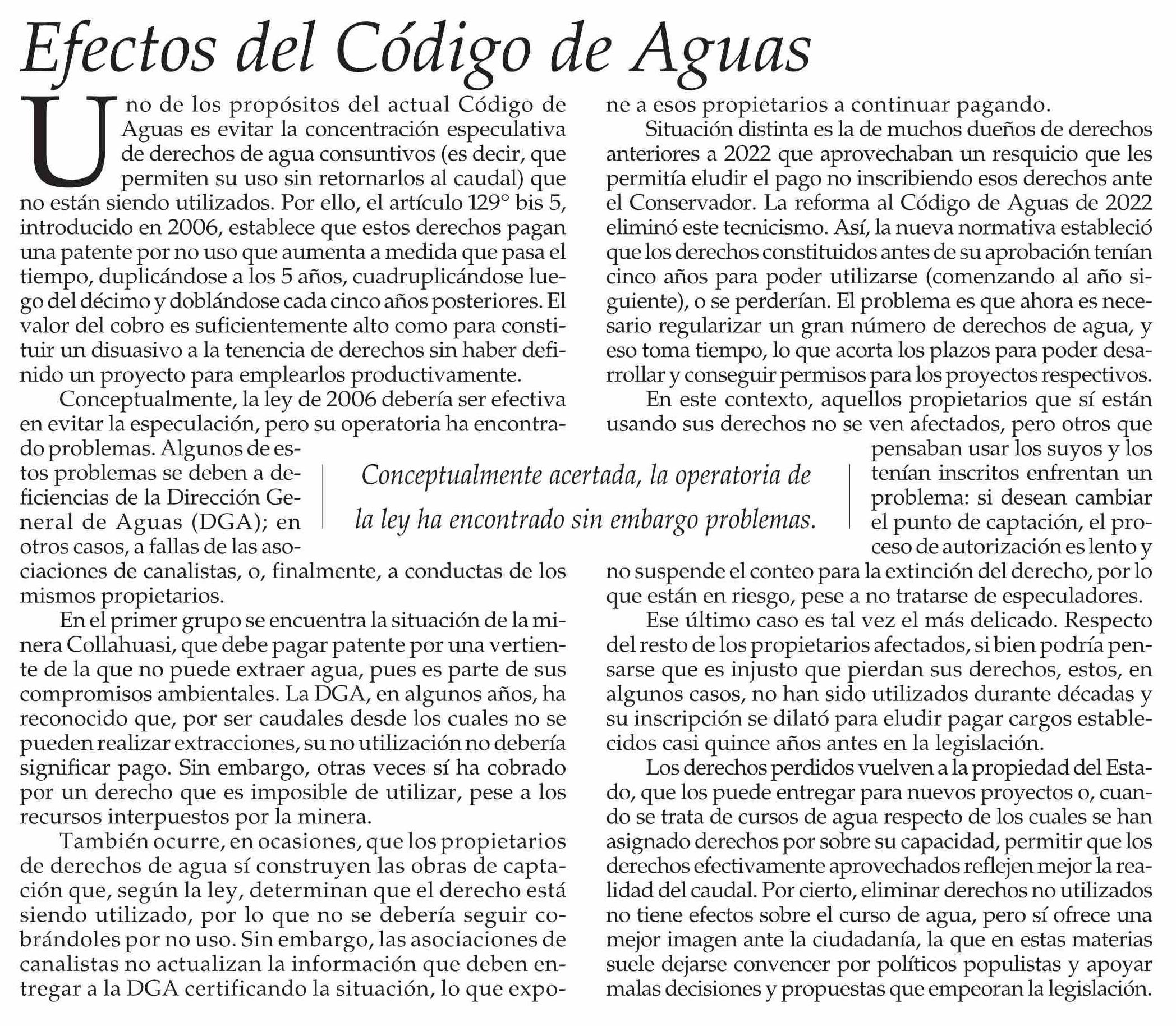 Editorial: Efectos del Código de Aguas 27-01-2026 El Mercurio |