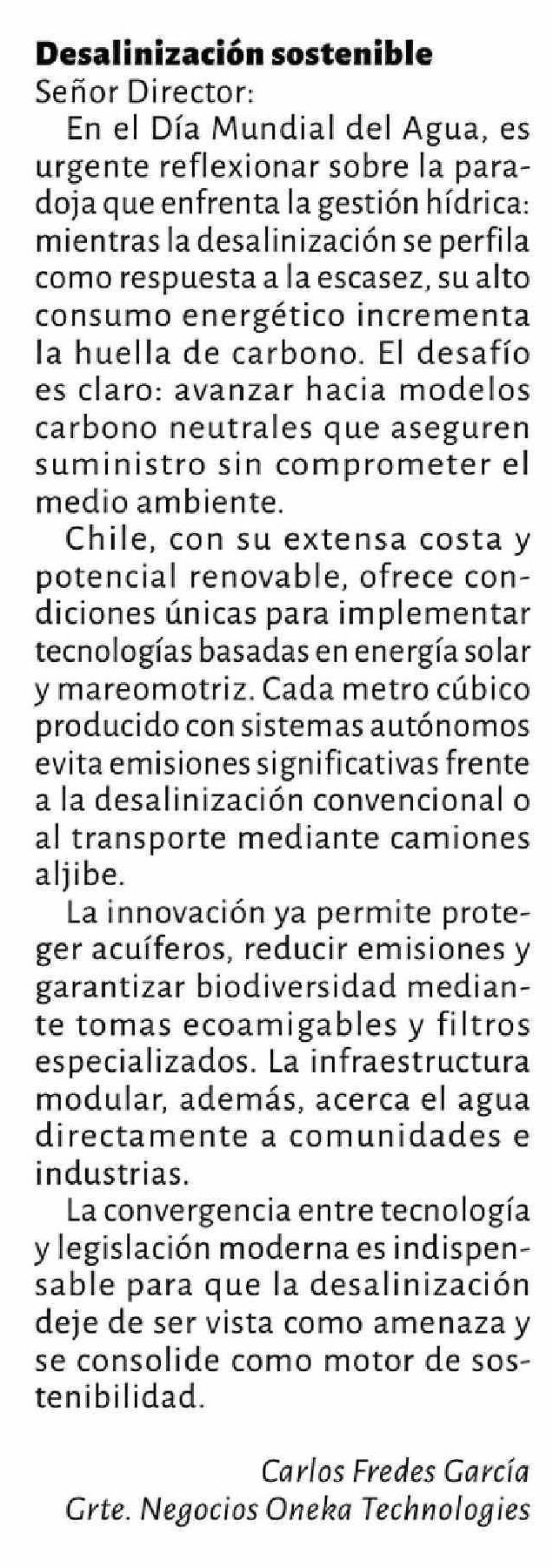 Título: Cartas: Desalinización sostenible Señor Director: En el Día Mundial del Agua, es urgente reflexionar sobre la paradoja que enfrenta la gestión hídrica: mientras la desalinización se perfila como respuesta a la escasez, su alto consumo energético incrementa la huella de carbono. El desafío es claro: