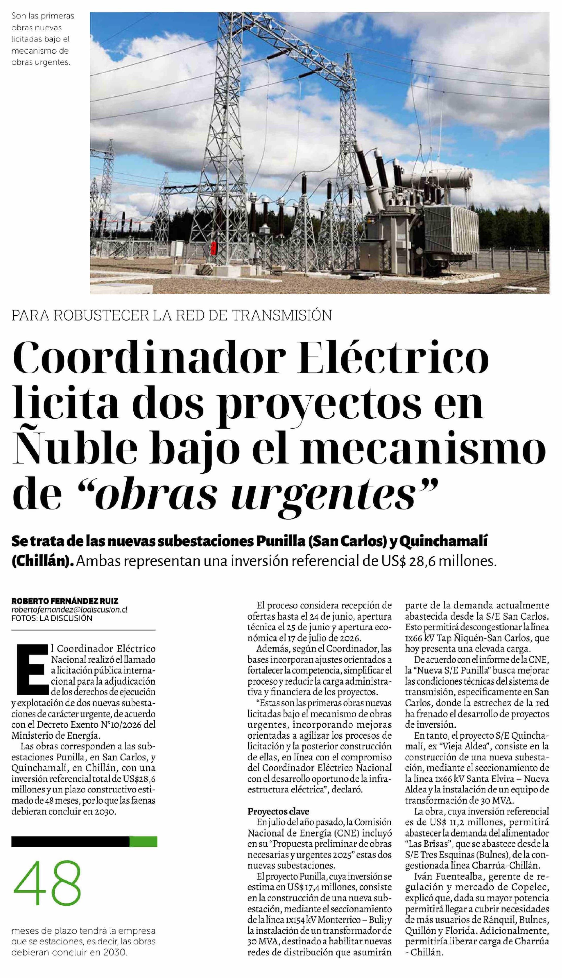 Coordinador Eléctrico licita dos proyectos en Ñuble bajo el mecanismo de "obras urgentes" 20-03-2026 La Discusión |