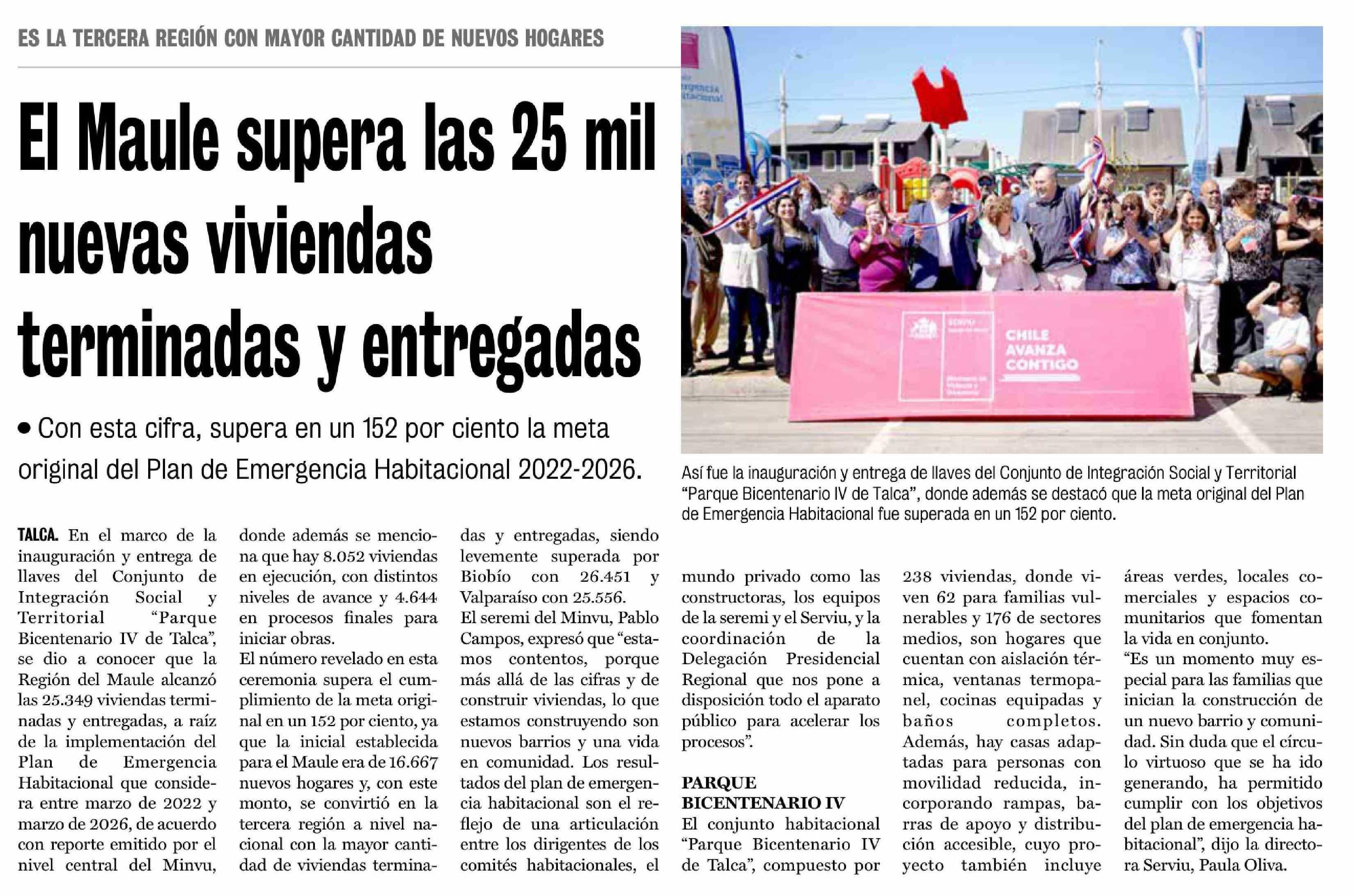 El Maule supera las 25 mil nuevas viviendas terminadas y entregadas 15-02-2026 La Prensa de Curicó |