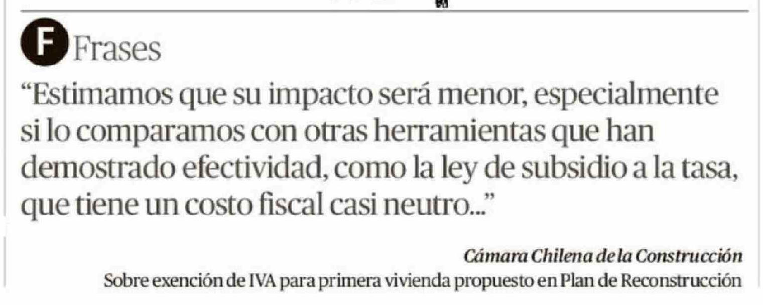| Título: | Cámara Chilena de la Construcción Sobre exención de IVA para primera vivienda propuesto en Plan de Reconstrucción |