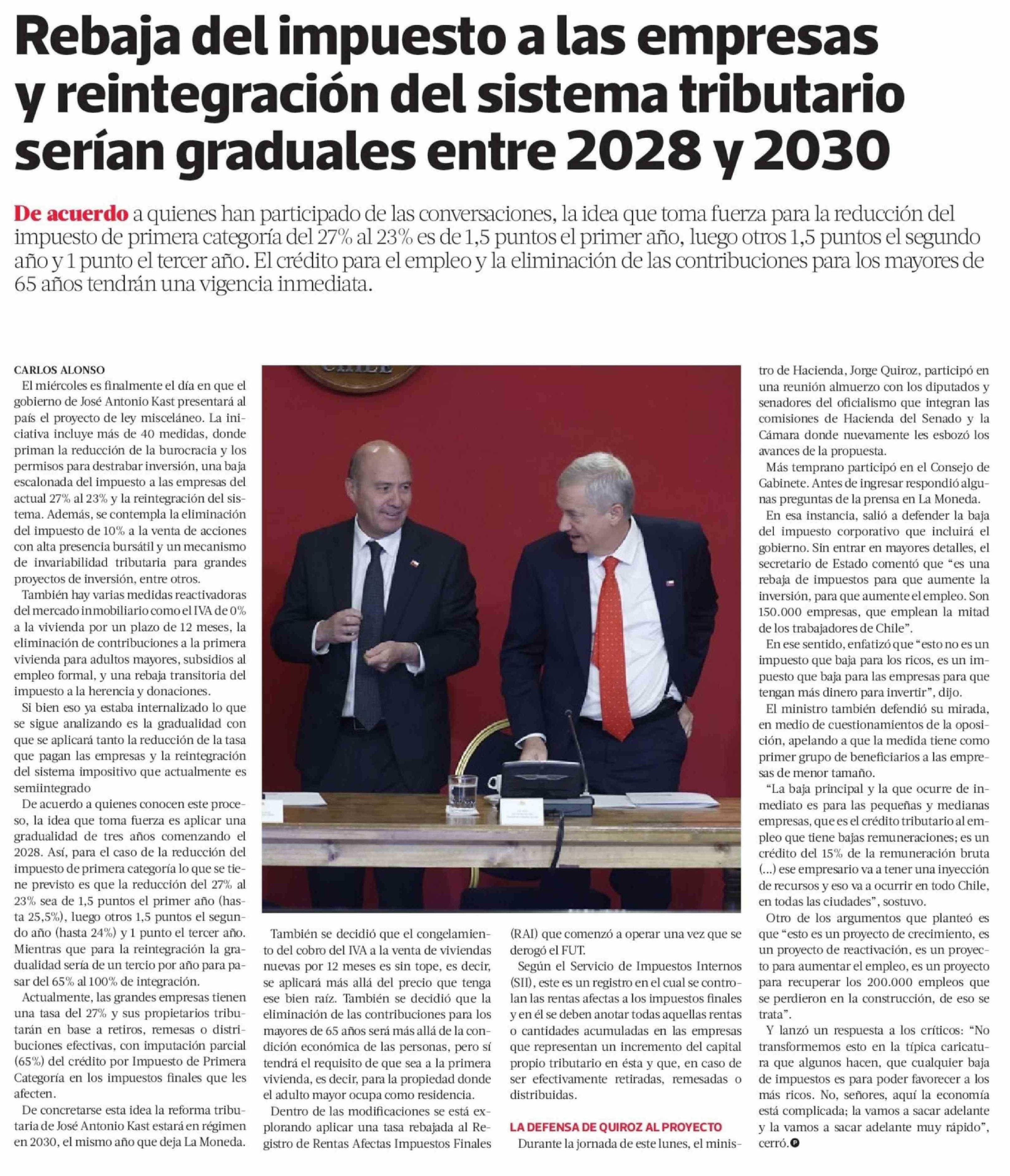 Título: Rebaja del impuesto a las empresas y reintegración del sistema tributario serían graduales entre 2028 y 2030