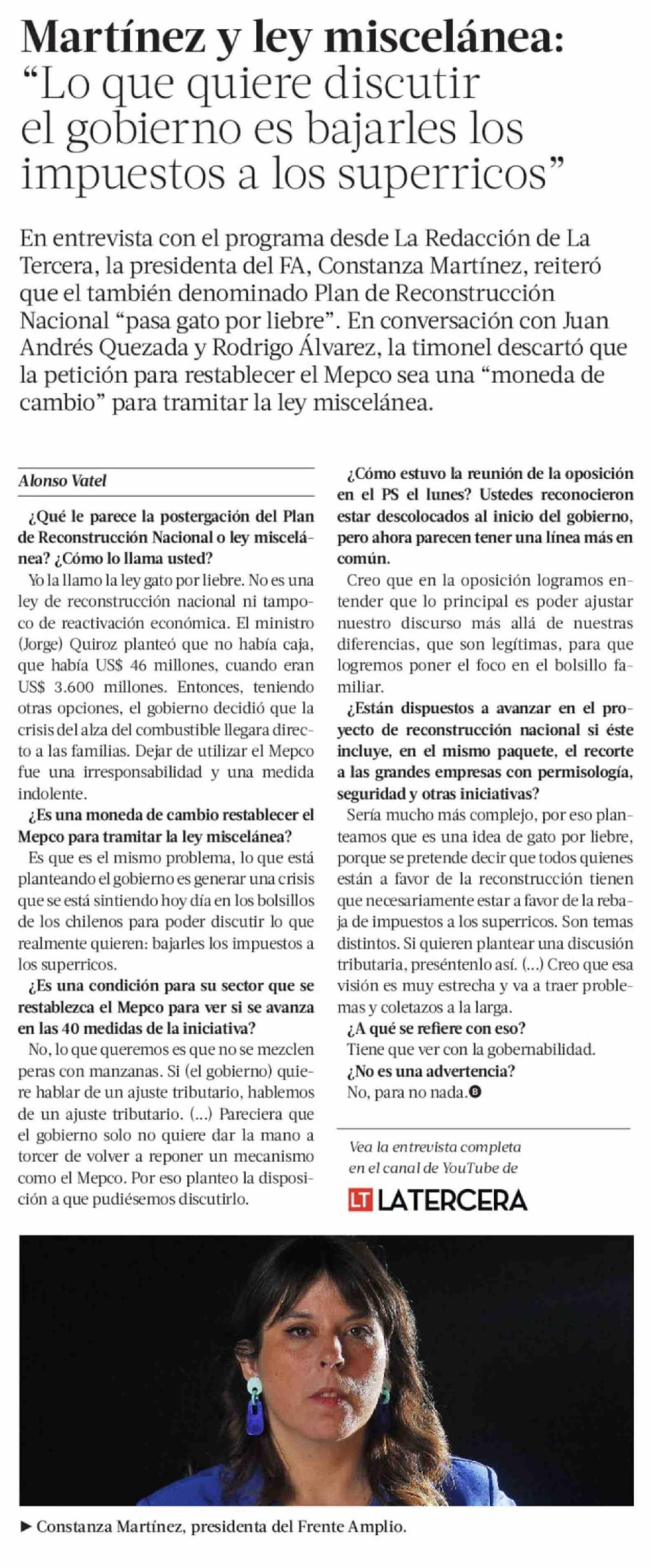 Martínez y ley miscelánea: "Lo que quiere discutir el gobierno es bajarles los impuestos a los superricos" 08-04-2026 La Tercera |