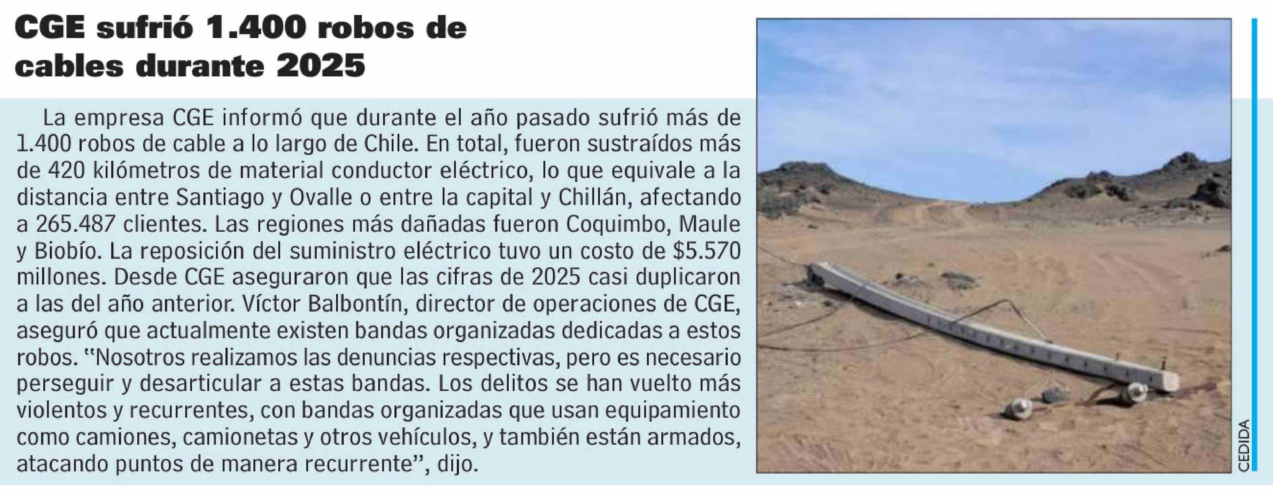 | Título: | CGE sufrió 1.400 robos de cables durante 2025 |