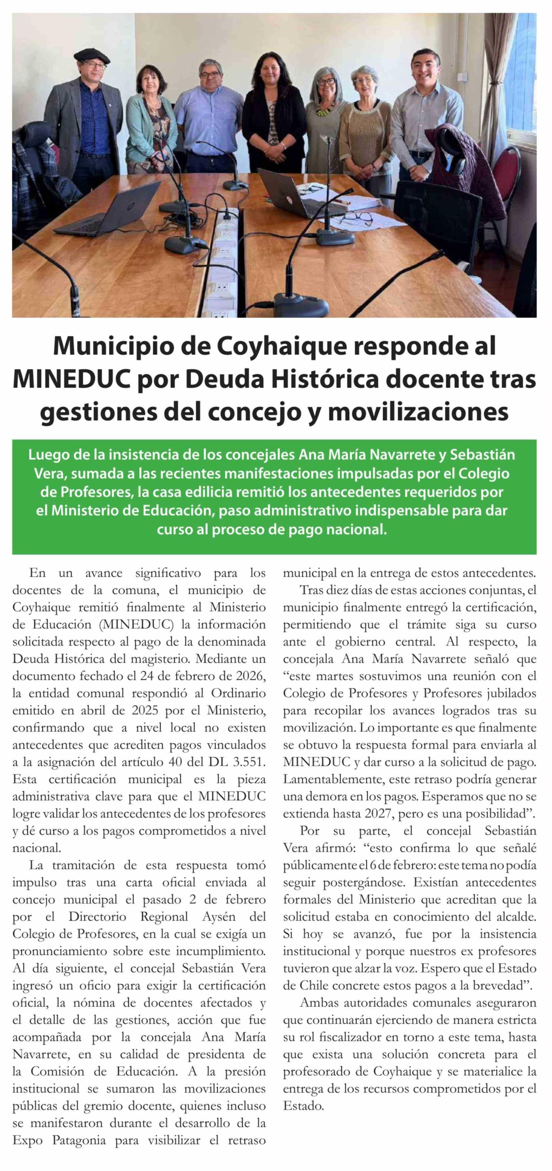 Municipio de Coyhaique responde al MINEDUC por Deuda Histórica docente tras gestiones del concejo y movilizaciones 26-02-2026 El Divisadero |