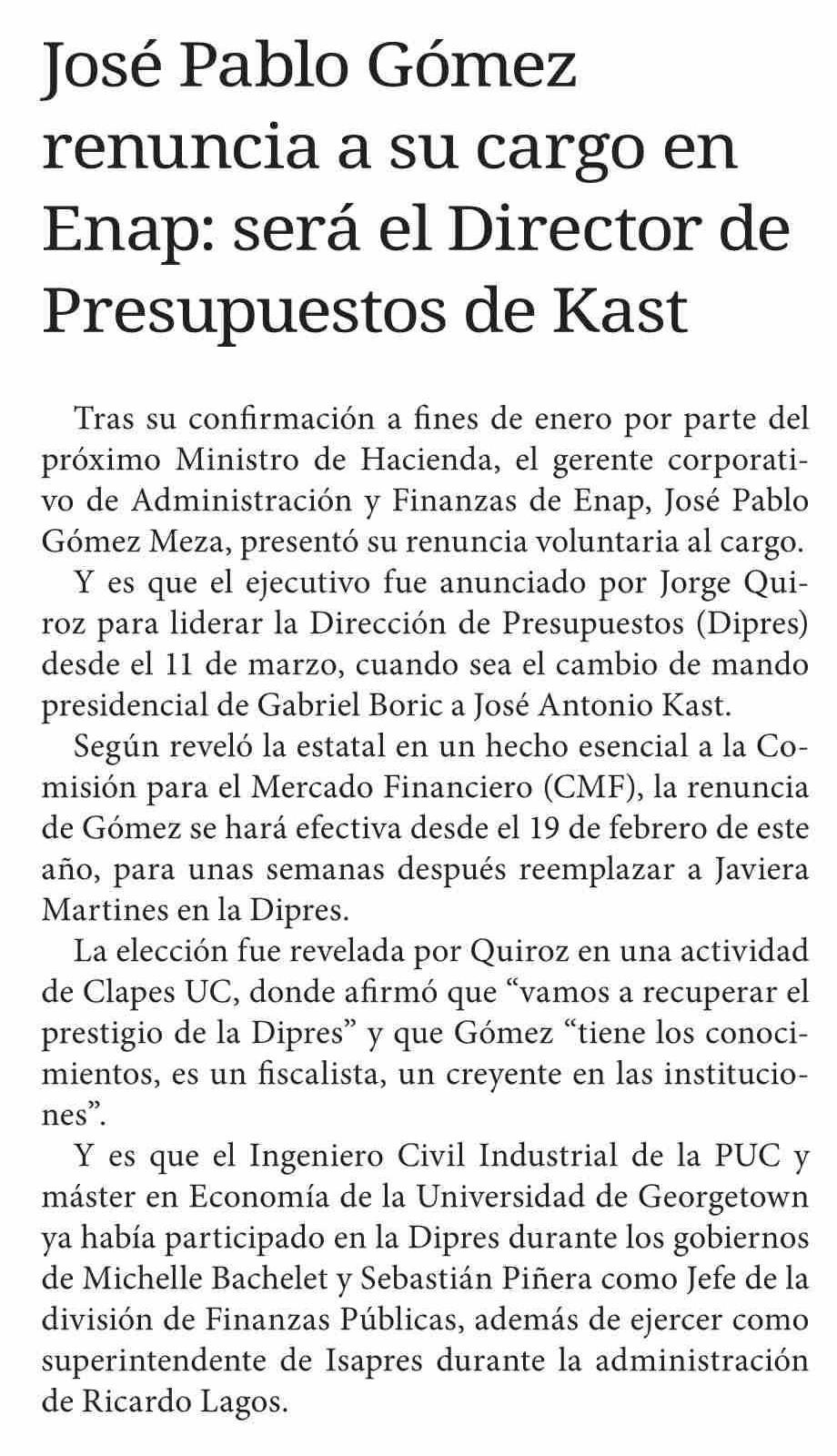 José Pablo Gómez renuncia a su cargo en Enap: será el Director de Presupuestos de Kast 07-02-2026 Diario Chañarcillo |