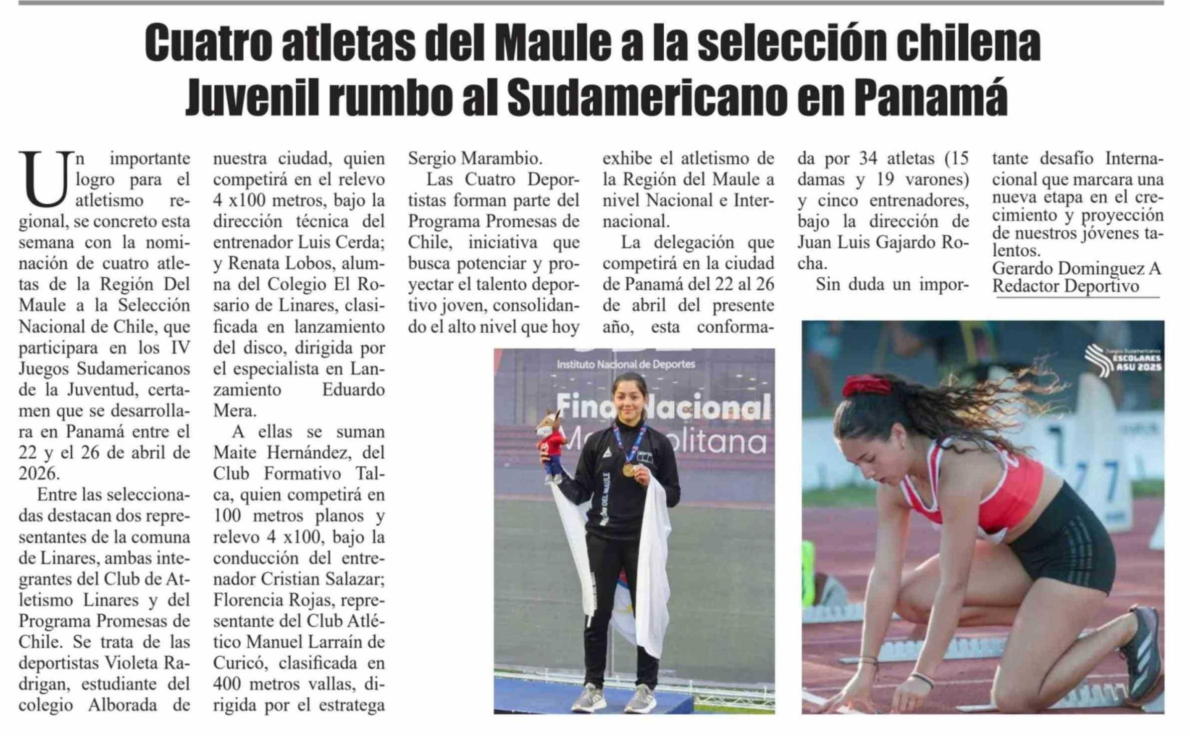 Cuatro atletas del Maule a la selección chilena Juvenil rumbo al Sudamericano en Panamá 05-03-2026 El Heraldo |