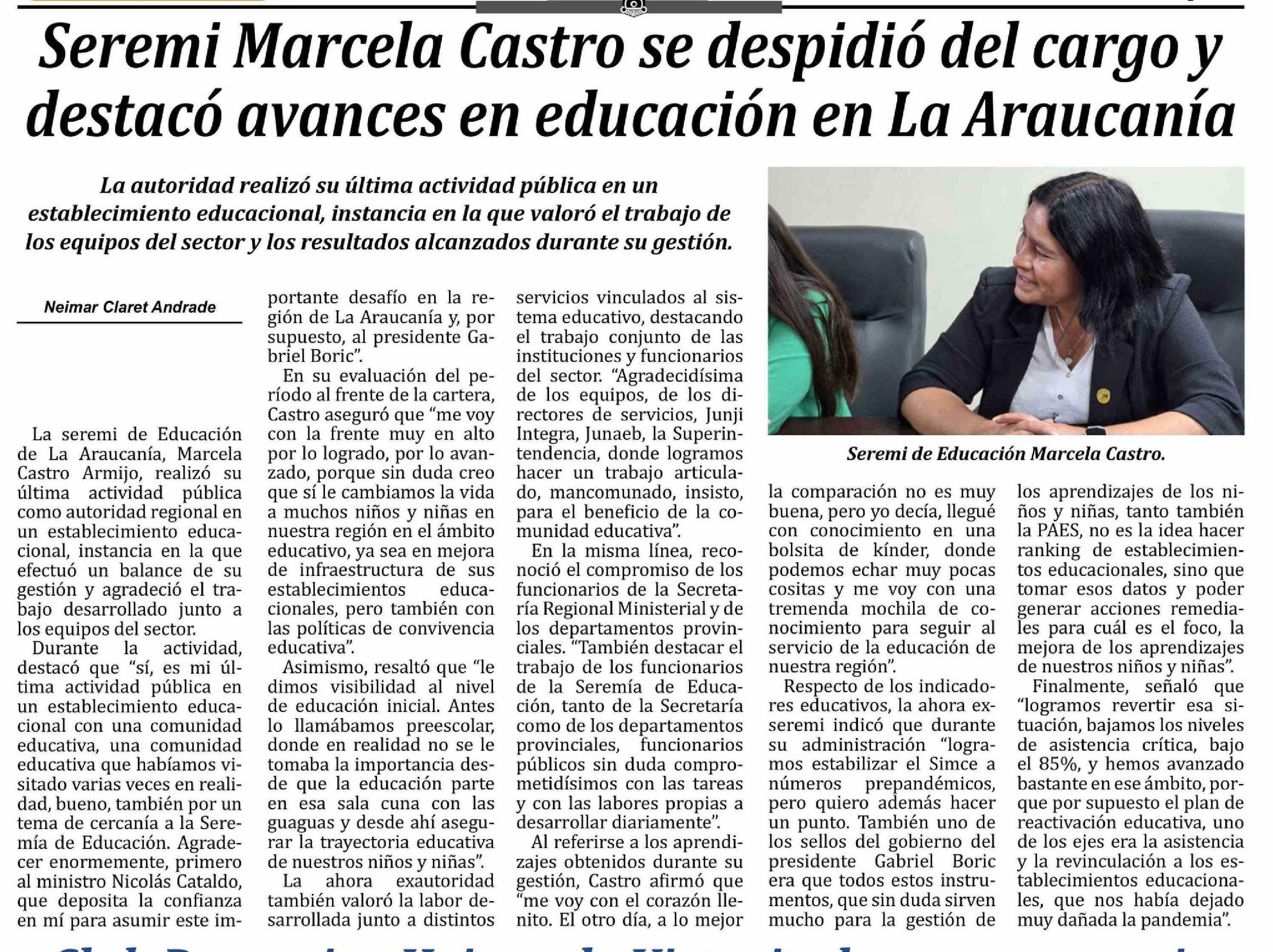 | Título: | Seremi Marcela Castro se despidió del cargo y destacó avances en educación en La Araucanía |