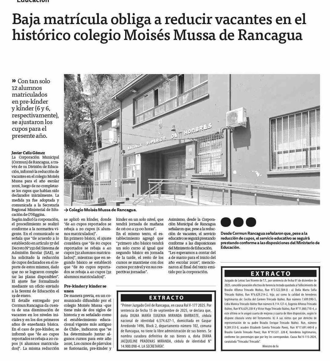 | Título: | Baja matrícula obliga a reducir vacantes en el histórico colegio Moisés Mussa de Rancagua |