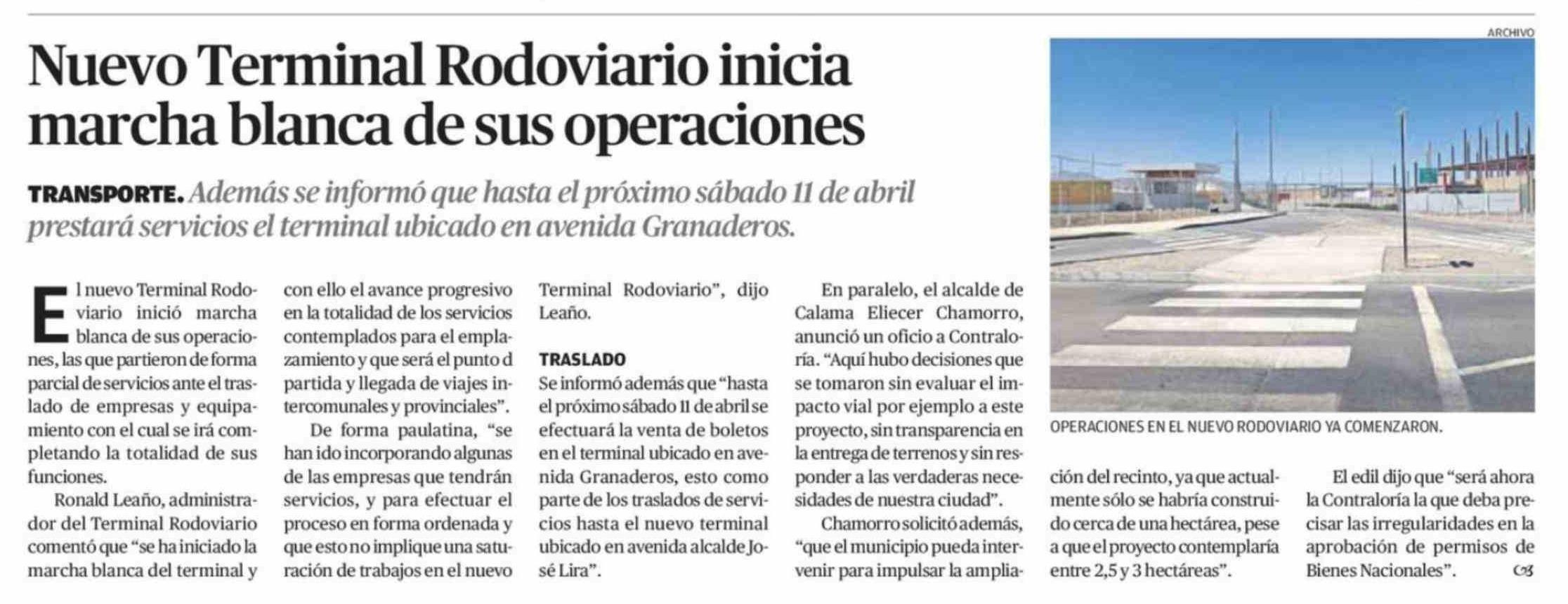 Nuevo Terminal Rodoviario inicia marcha blanca de sus operaciones 08-04-2026 El Mercurio de Calama |