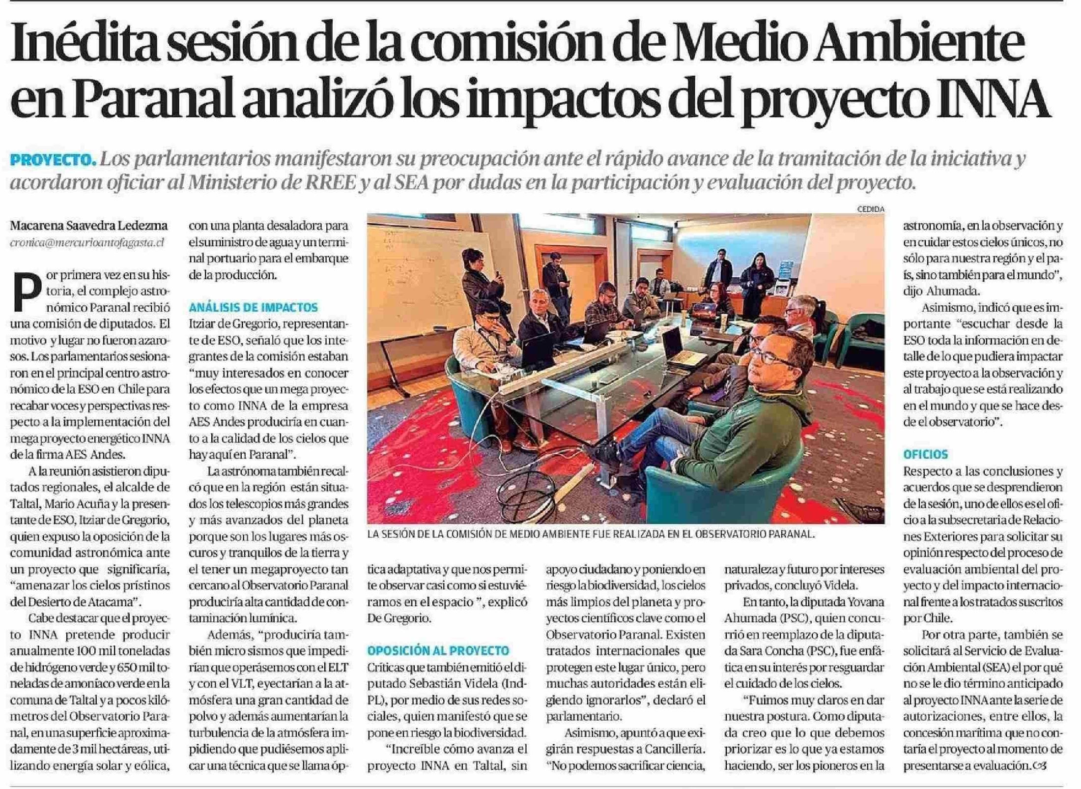 Inédita sesión de la comisión de Medio Ambiente en Paranal analizó los impactos del proyecto INNA 13-06-2025 El Mercurio de Antofagasta |