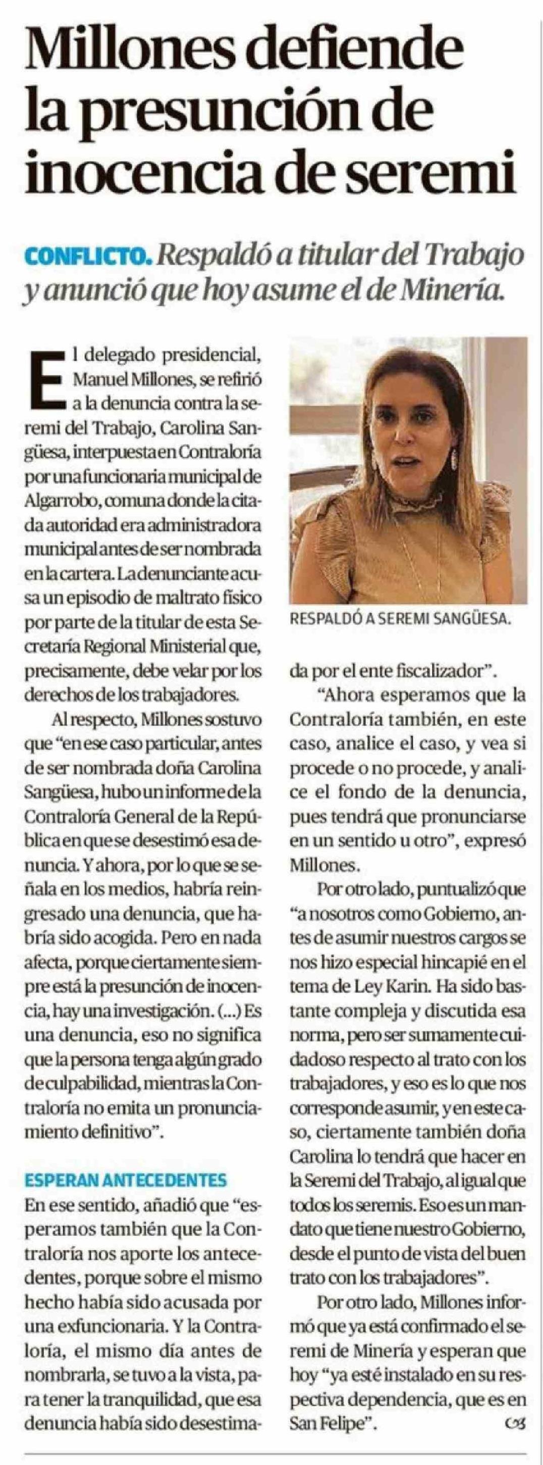 Título: Millones defiende la presunción de inocencia de seremi